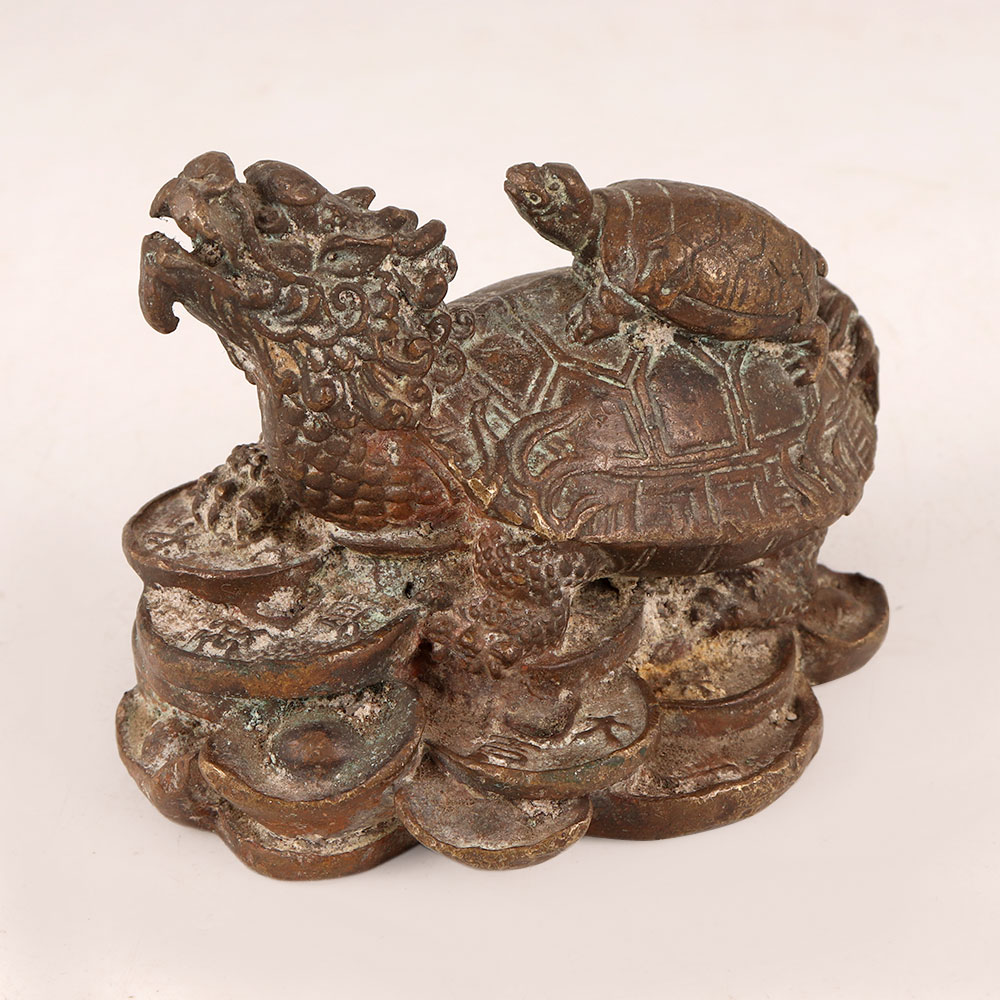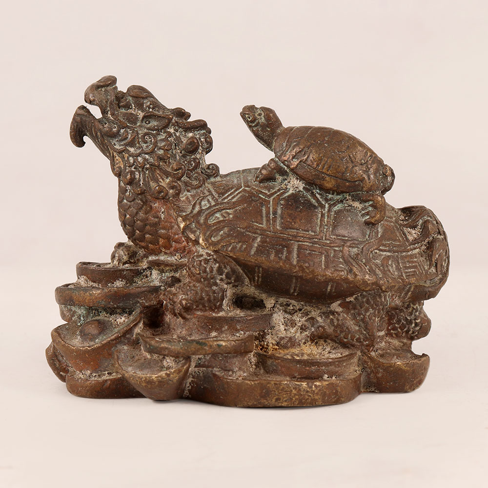 Immerse your space in the enchanting aura of Chinese Art with this exquisite handmade brass statue that is a small turtle mounted on a larger turtle, boasting an alluring antique brown finish. Crafted with precision and passion by skilled artisans, this remarkable piece is more than just a decorative item, it's a symbol of good luck and positive energy. The intricate details captured in the brass bring this charming turtle duo to life, serving as a captivating addition to any environment. Whether adorning your home, office, restaurant, hotel, cafe, or shop, its presence exudes a sense of ancient wisdom and harmony. The piece's versatile size ensures it can be placed almost anywhere, adding an air of elegance to the surroundings. Ideal for collectors, this brass statue seamlessly fits into vintage collections, showcasing its cultural significance and timeless appeal. Beyond its decorative allure, the statue carries profound cultural connotations, making it an extraordinary gift choice for your loved ones on special, festive, or auspicious occasions.