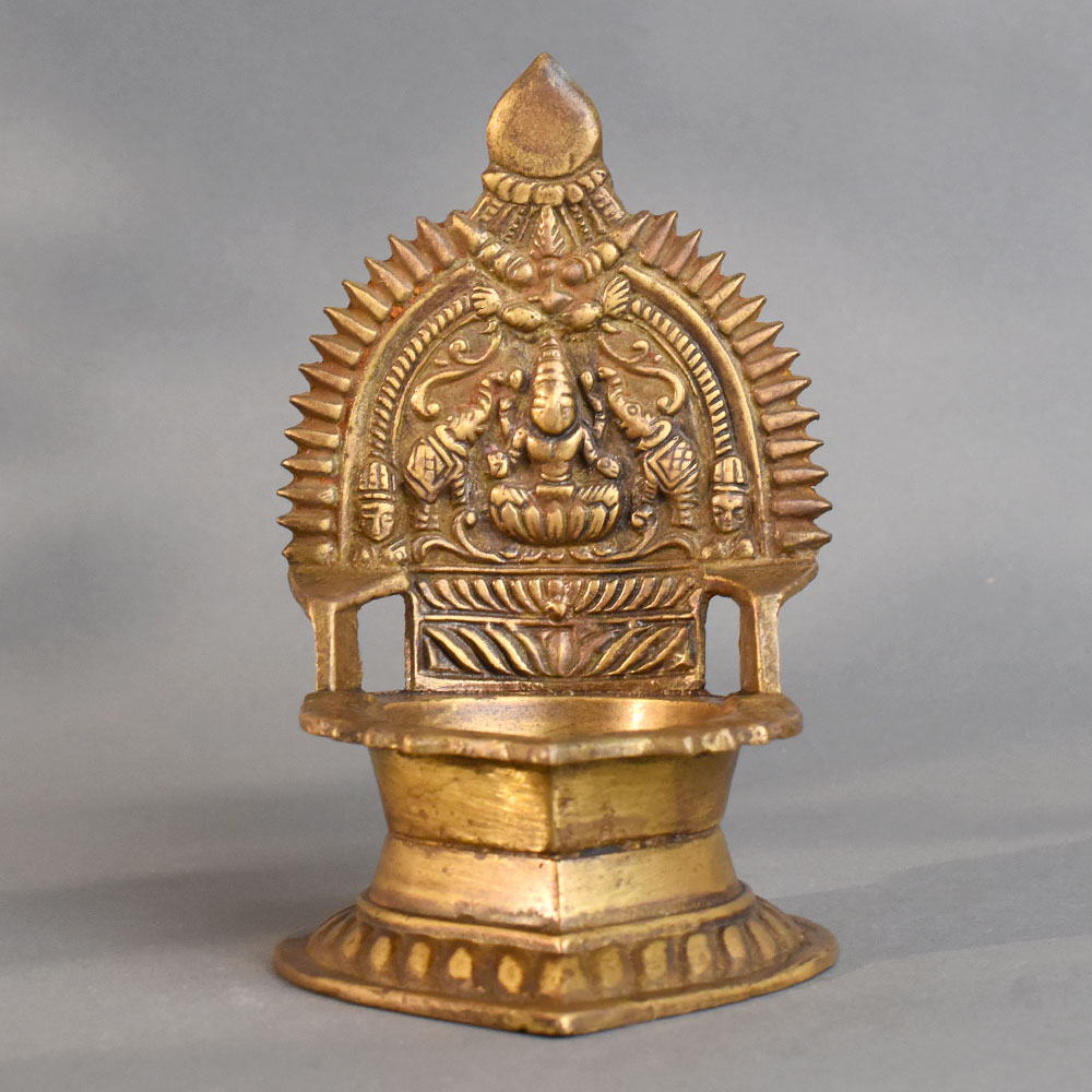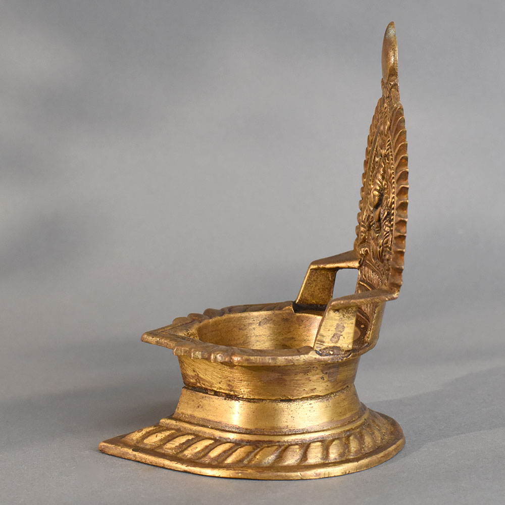 This handmade vintage brass pooja diya beautifully showcases South Indian artistry, featuring an intricate design of Lord Ganesha on the backplate. Symbolizing wisdom and prosperity, the diya is carefully crafted with traditional patterns that enhance its devotional value. Made from high-quality brass, it carries a timeless antique finish that adds authenticity and charm. Its deep oil-holding section makes it ideal for lighting during daily rituals, festive celebrations, or meditation practices. The sturdy base and ornate details reflect the rich heritage of temple-style craftsmanship, making it not only a functional lamp but also a spiritual and decorative centerpiece. Perfect for pooja rooms, home temples, and auspicious gifting, this diya radiates positive energy and cultural elegance.