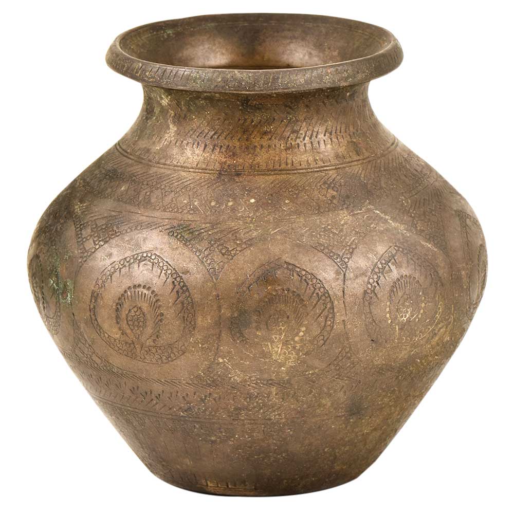A Southern Indian Brass Lota with Chiseled and Incised Decoration of Animated, Turbaned Figure in Roundel Repeated Around the Girth on a Ground of Saz Vine with Palmettes Above a Band of Acanthus Vine and Birds. An Inscription is Stippled Along the Everted Rim.