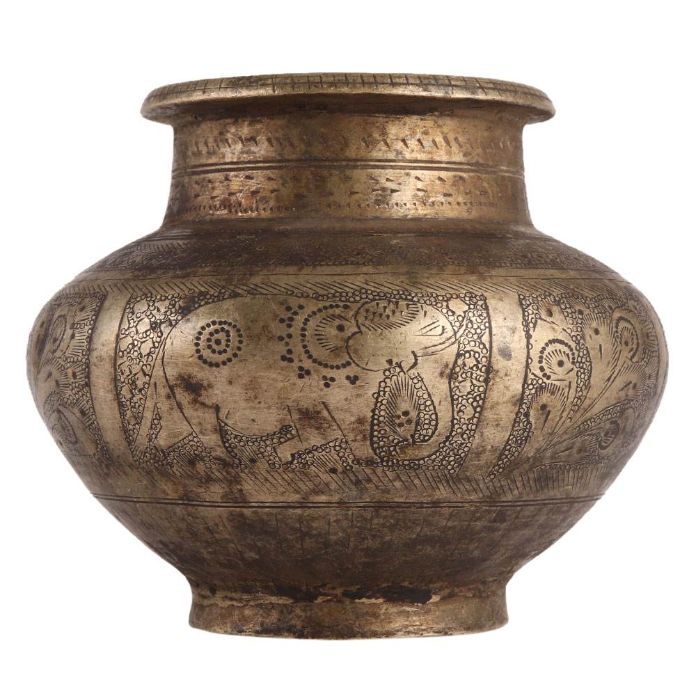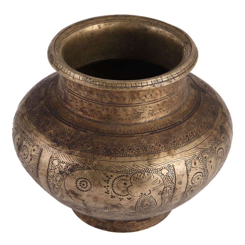 A rare and elegant water pot with elephant and floral motifs etched on the exterior. Other designer elements such as diamonds, circles, and sections are also carved on it. There are also additional circular borders with different designs to complete the look. It is used to keep holy water in temples and other religious sites.