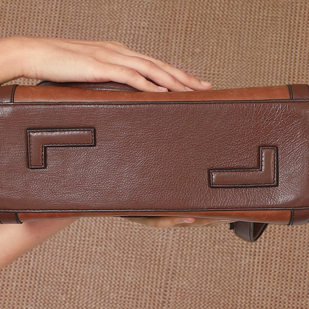 The zipper pocket on the back panel offers additional convenience for items you need to grab quickly. To top it off, the base feet in the shape of the logo adds a distinctive touch, elevating the totes overall look and keeping it upright and protected.