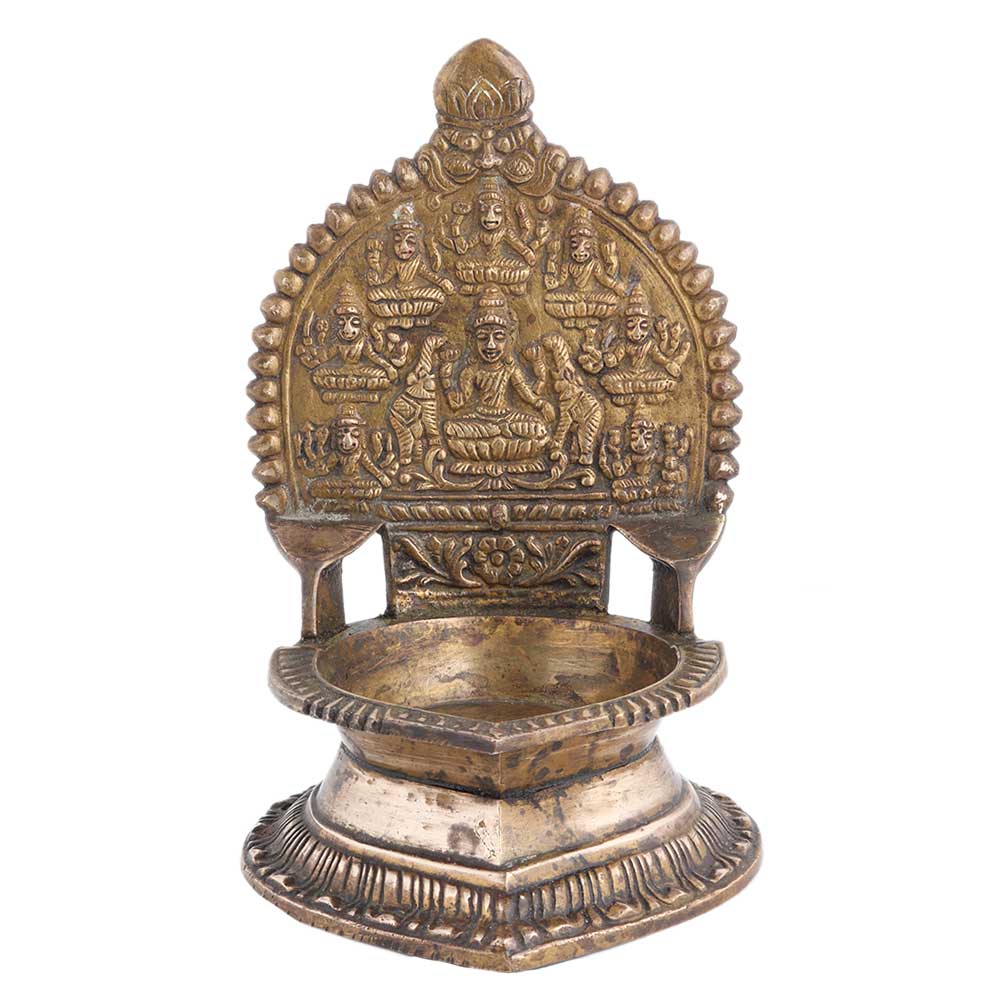 Handcrafted brass Ashtarakshmi oil lamp is represented and worshiped by groups in temples and homes. Gift it to your near and dear ones.