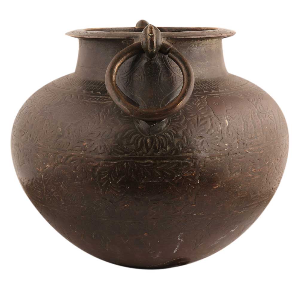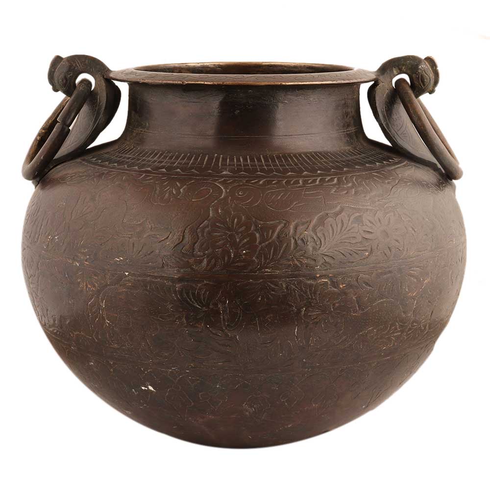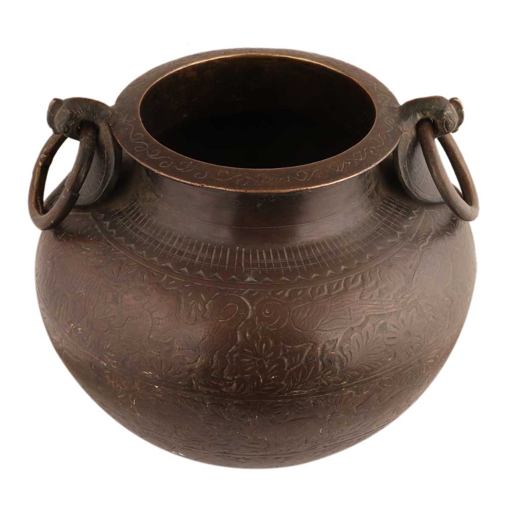 This lovely round brass planter pot engraved with floral design with heavy ring handles is made by expert craftsmen. Use it as indoor or outdoor decoration for home, office, school, spa, or hotel.