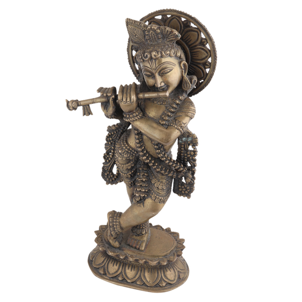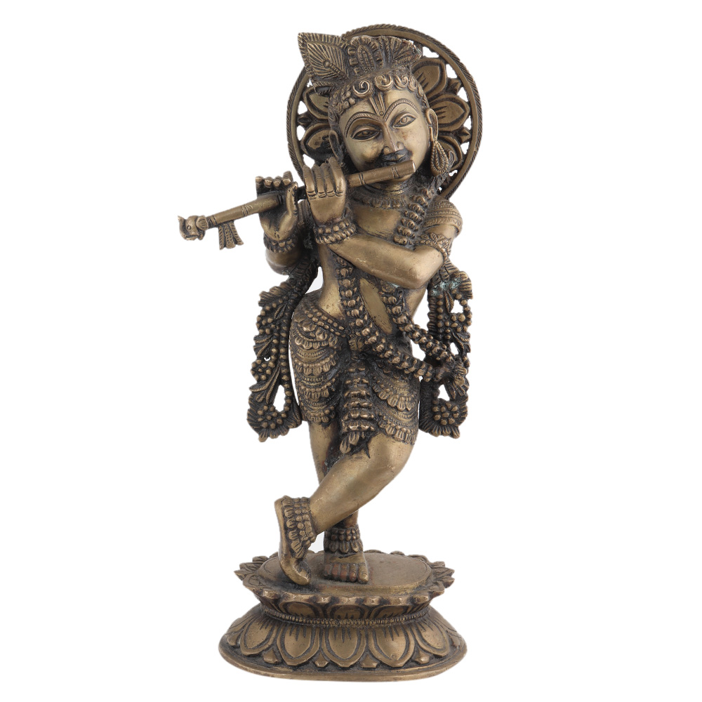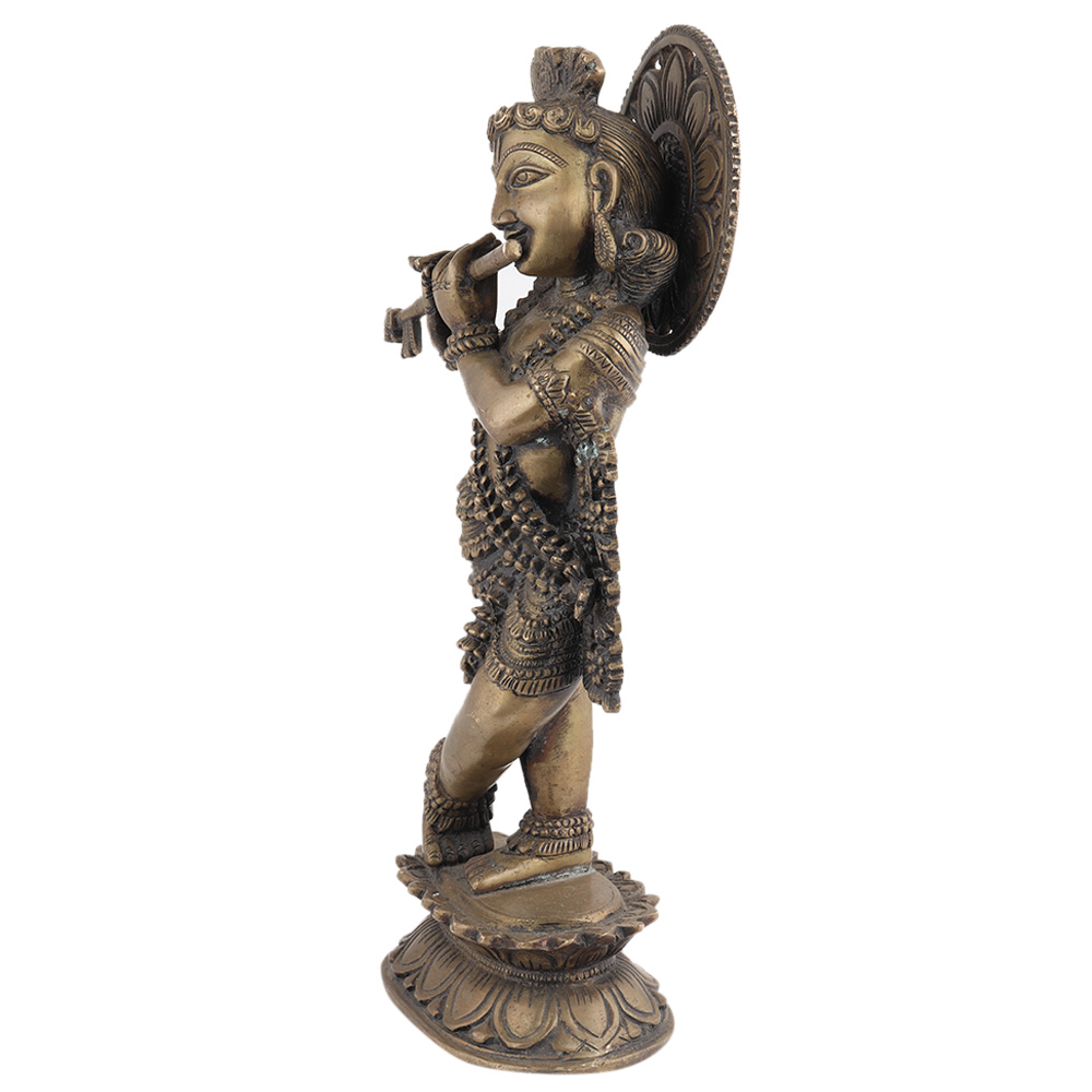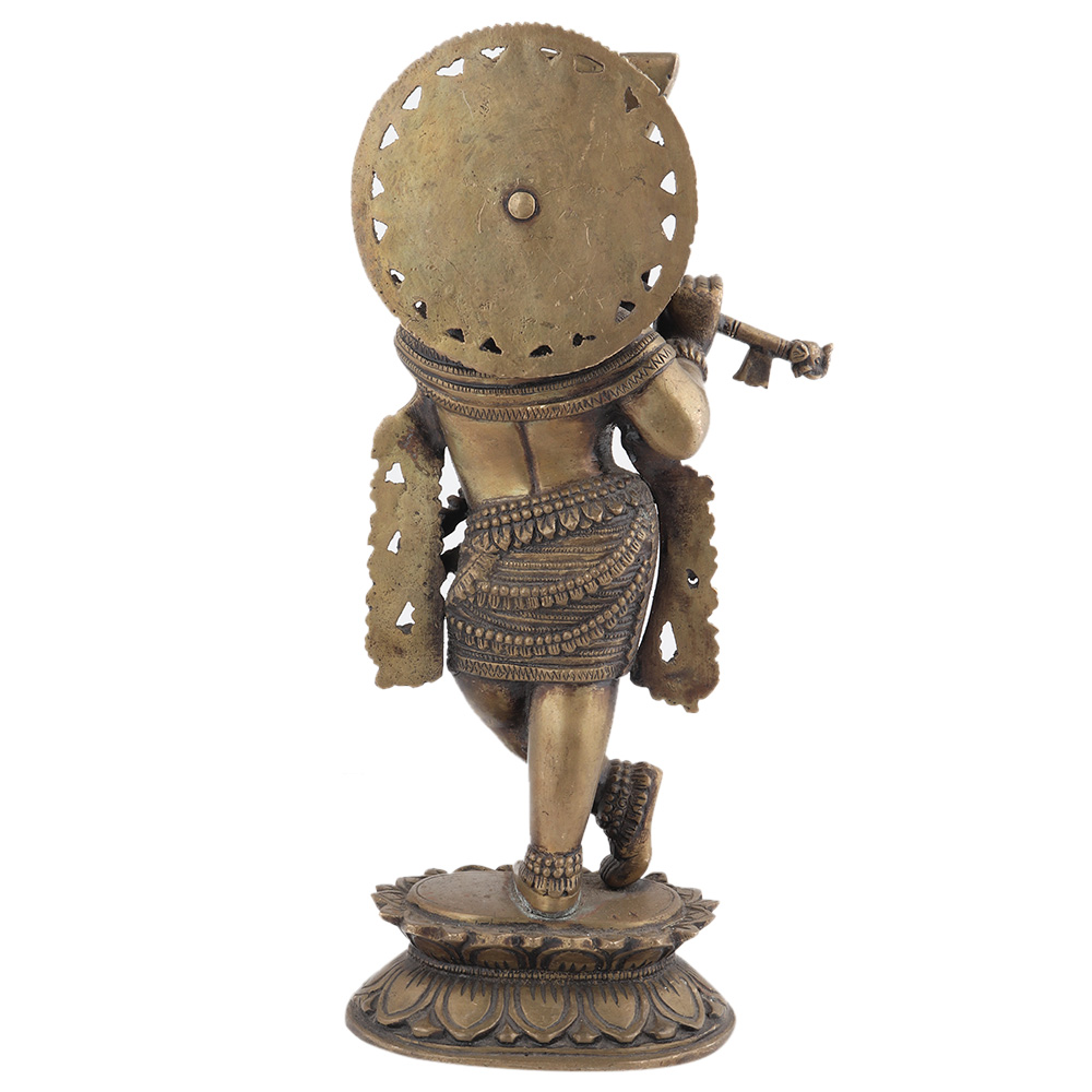 Handmade Brown Brass Standing Murli Krishna Statue With Intricate Design