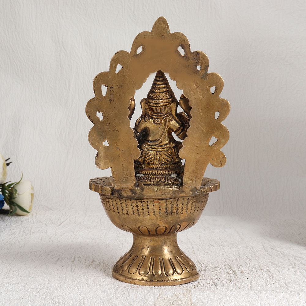 Buy a Vintage Brass Aarti Oil Lamp online that features an exquisite depiction of Lord Ganesha and an ornate Prabhavali in an enchanting antique brown finish. Crafted by highly skilled artisans using the finest quality brass, this lamp is a true masterpiece of traditional craftsmanship. The lamp's versatility knows no bounds, making it a perfect addition to your home, office, restaurant, hotel, cafe, or shop. Its presence exudes an aura of divine charm, making it a captivating decorative piece that stands out in any setting. Not just a decorative item, this oil lamp also holds immense religious significance. Light it during prayers, rituals, or auspicious occasions, and experience the warm, inviting glow that fills the space. You can use mustard oil or ghee along with cotton wicks to kindle the lamp, infusing the surroundings with a sacred ambiance. This antique brass oil lamp is a cherished addition to any vintage collection, and it also makes for a thoughtful gift for your loved ones on special, festive, or auspicious occasions.