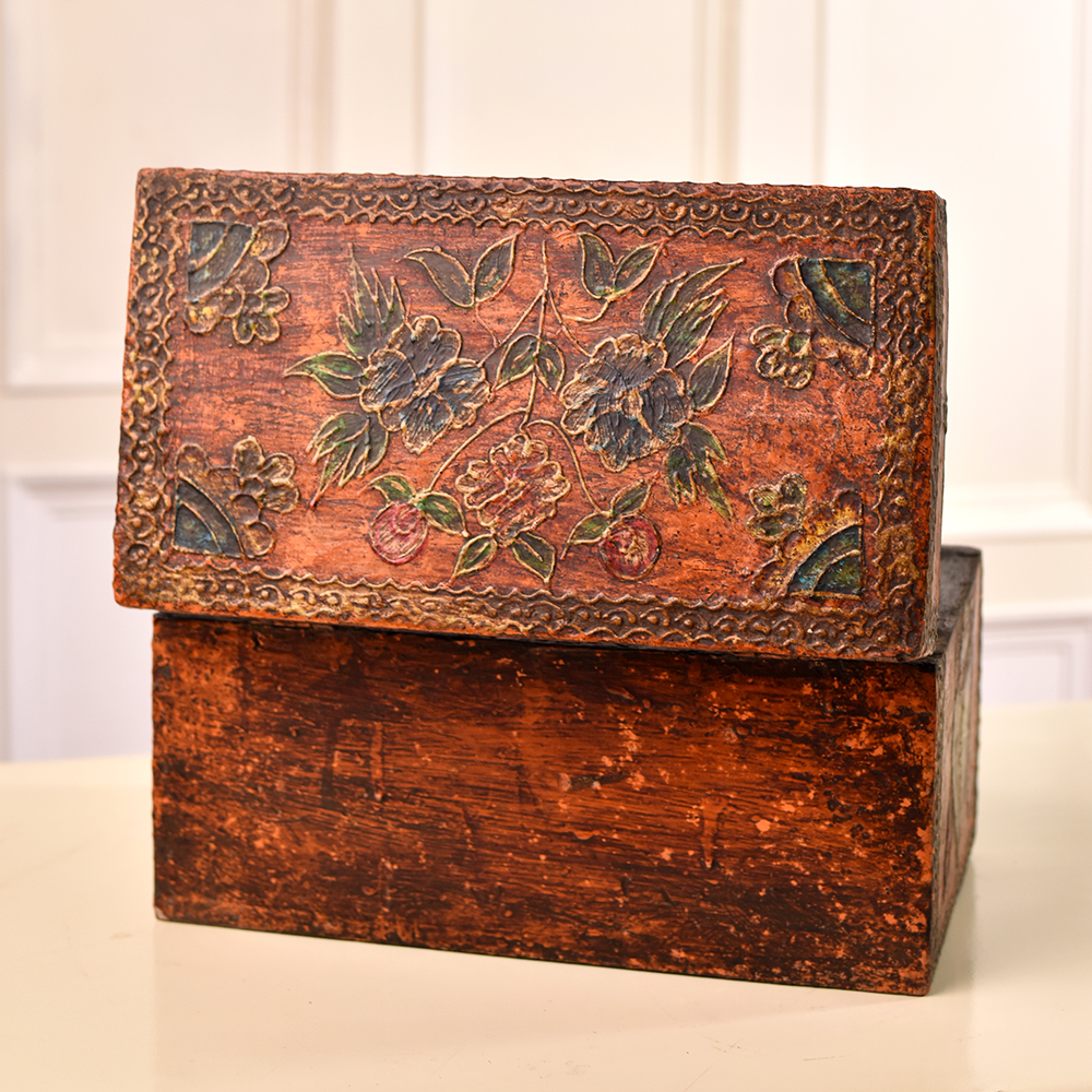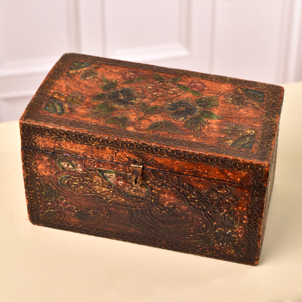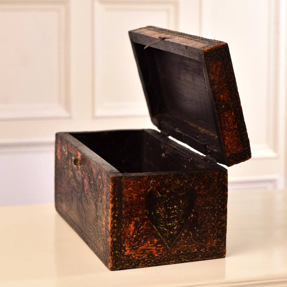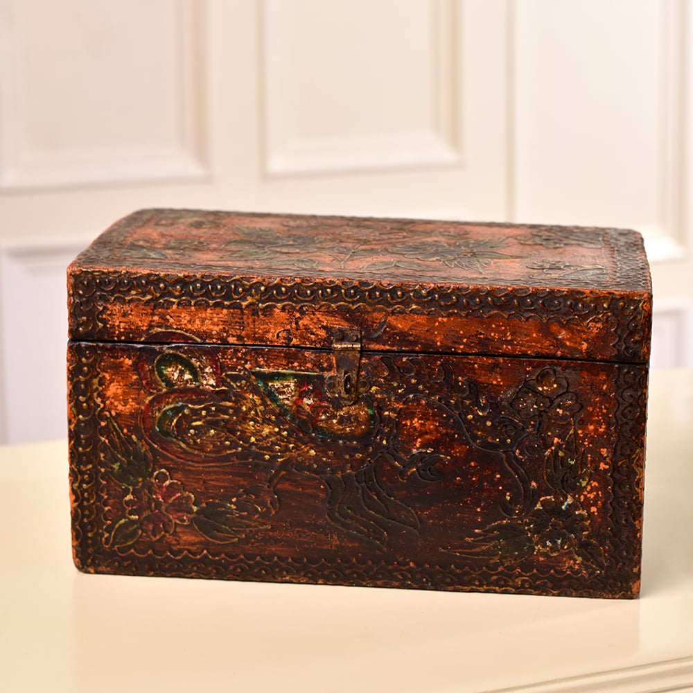 Buy a rectangular wooden box online that is a true masterpiece of craftsmanship and elegance. This beautiful box is adorned with intricate engravings that showcase the remarkable skill of Indian artisans, meticulously handcrafted from high-quality wood. Its antique brown finish adds a touch of timeless charm, making it a truly enchanting addition to your collection. This versatile box features a secure latch, making it perfect for safeguarding your precious jewelry and small keepsakes. Its spacious interior provides ample room for storing various treasures, ensuring your cherished items are always close at hand. Not only is this wooden box a practical storage solution, but it also serves as a captivating display piece. Its ornate engravings and rich, antique finish make it a conversation starter at any exhibition or gathering. This exquisite creation also makes for an ideal gift for your loved ones on special or festive occasions, expressing your affection with a touch of Indian artistry.