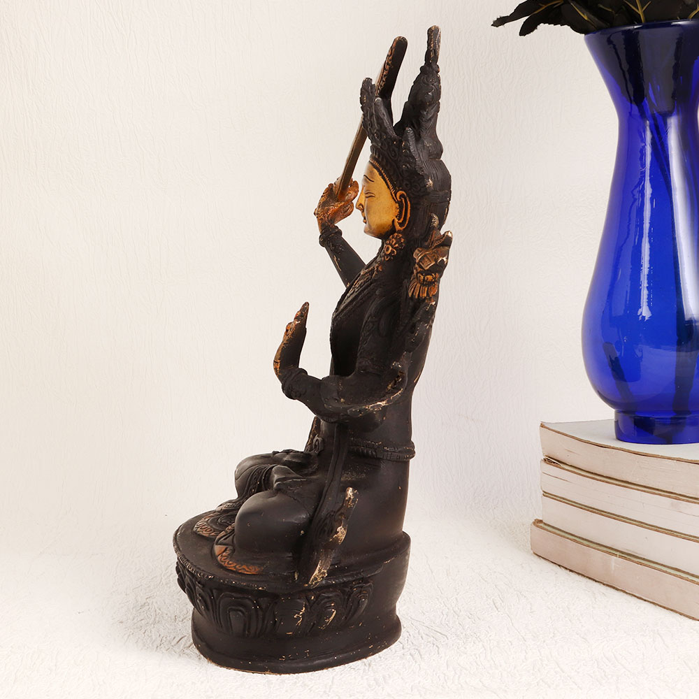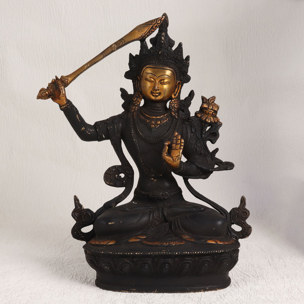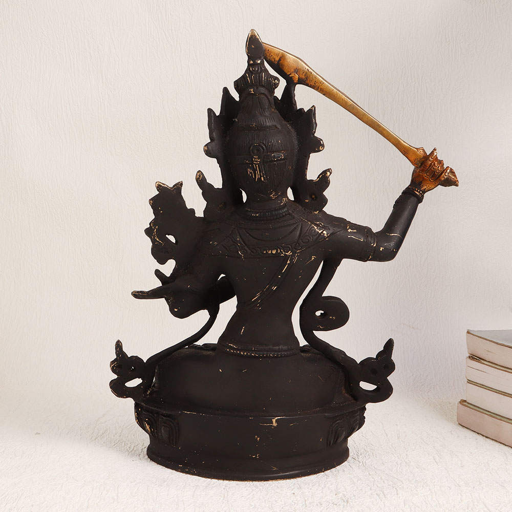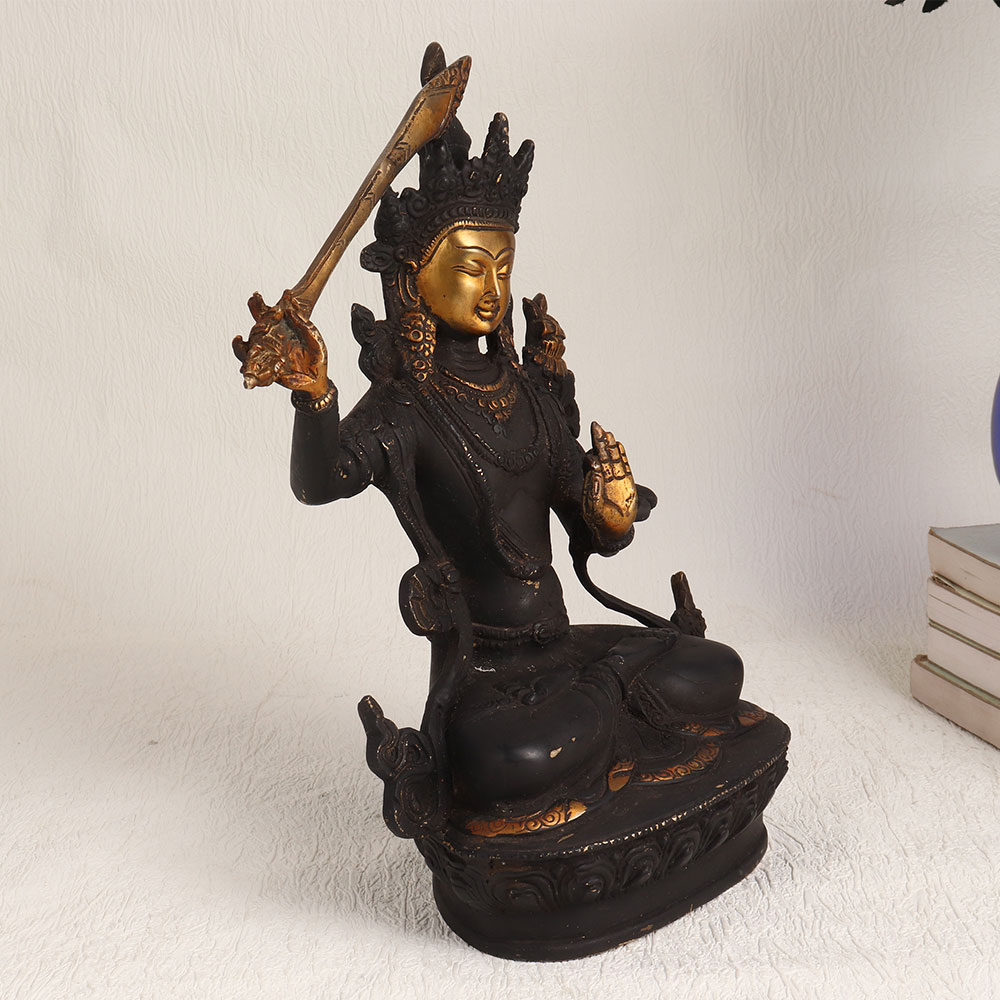 Immerse yourself in the timeless beauty of Tibetan art with this exquisite brass statue of the revered Buddhist deity Manjushri. Handcrafted with precision and devotion by highly skilled Tibetan artisans, this statue exudes an air of spirituality and craftsmanship that is unparalleled. Standing in a poised and meditative posture, Manjushri is depicted with intricate detailing and a rich antique brown finish that adds an aura of authenticity to this remarkable piece. Crafted from high-quality brass, the statue embodies the perfect blend of artistry and spirituality. Versatile in its application, this Manjushri statue can find a special place in your home, office, restaurant, hotel, cafe, or shop. It serves as an ideal addition to prayer rooms, where it can inspire tranquillity and devotion. Moreover, it doubles as a striking decorative piece, enhancing the aesthetic appeal of any space. This masterpiece can also grace your vintage collection or become a star attraction at exhibitions. Additionally, it makes for a thoughtful and meaningful gift for your loved ones on special, festive, or auspicious occasions.