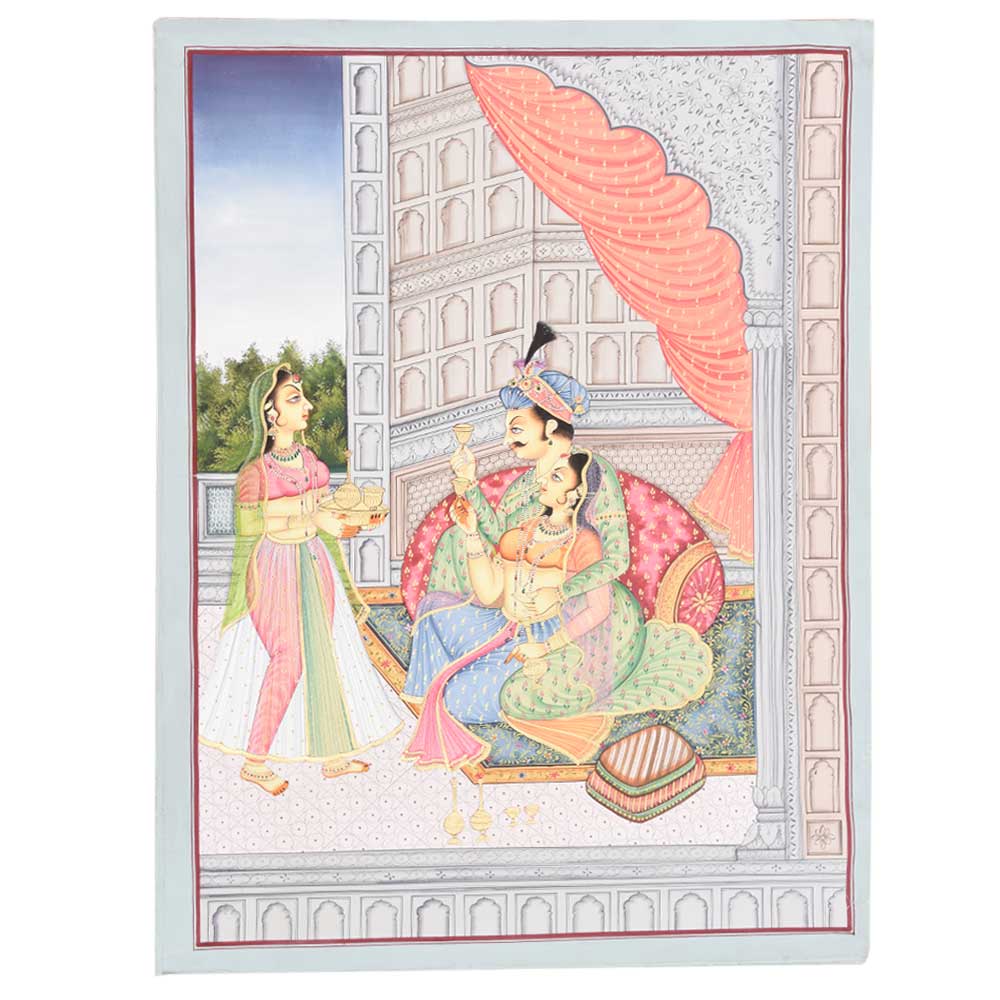 • Handmade Canvas Mughal Painting Of the Emperor With His Queen Enjoying Love