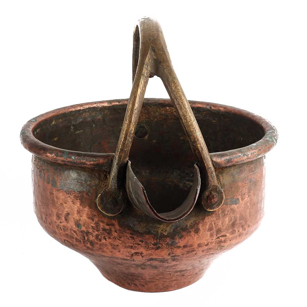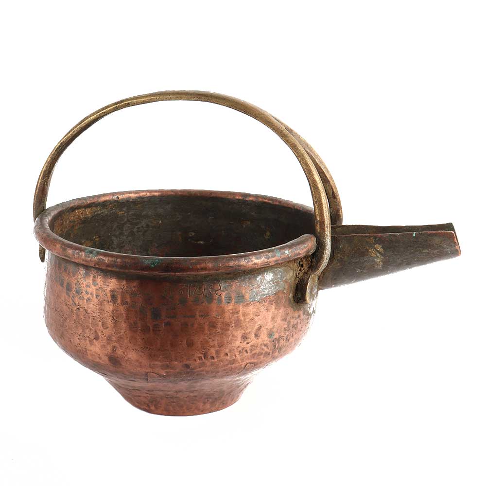 A handmade copper-colored brass metal bowl with a handle and spout is a rare decorative kitchen utensil, tableware. It is an ideal Diwali gift or wedding gift.