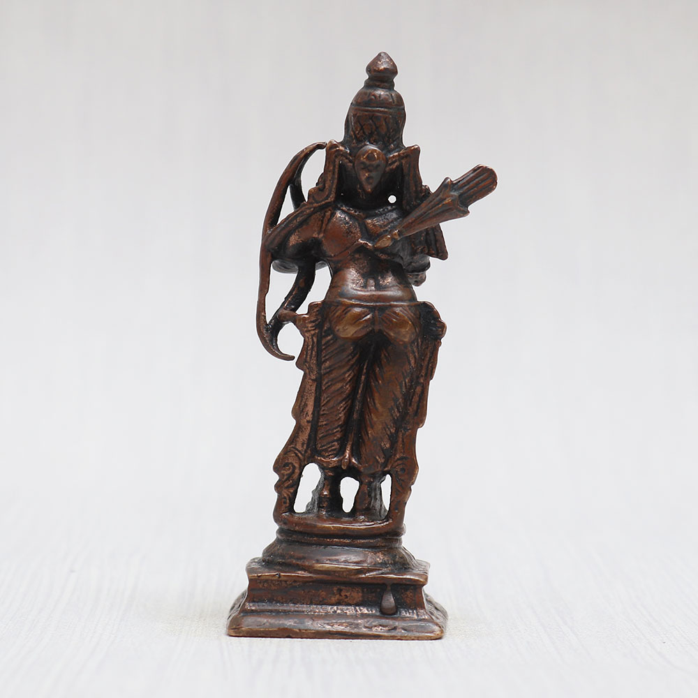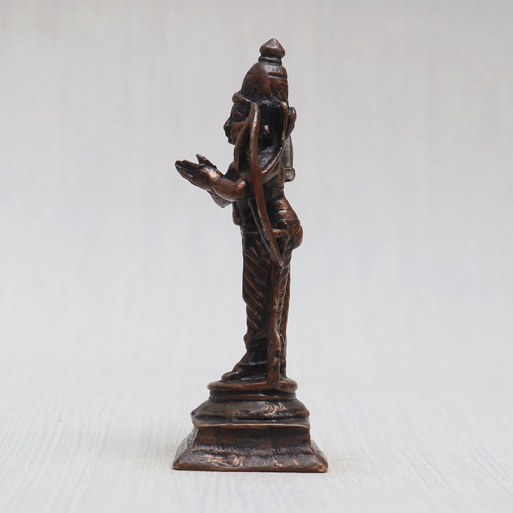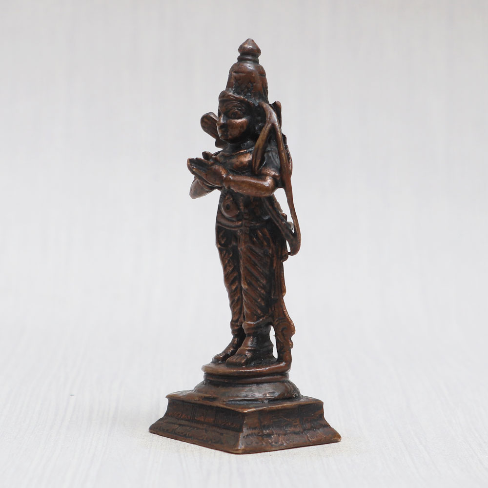 This copper statue of Lord Ram is crafted with utmost devotion by skilled Indian artisans. This awe-inspiring piece showcases Lord Ram standing gracefully, his hands folded in reverence. Adorned with intricate detailing and a vintage-style finish, the statue exudes a timeless charm. Carrying a bow on his left shoulder and a quiver of arrows on his back, this divine masterpiece captures Lord Ram's heroic and benevolent essence. Ideal for your prayer room at home, office, restaurant, cafe, or shop, it serves as a captivating item for decoration, collection, and exhibitions. Embrace the spirituality of your space by placing this divine creation in your temple for worship. It's the perfect gift for your loved ones on special, festive, or auspicious occasions. Now you can easily buy idols online, including this enchanting Lord Ram statue, and bring the divine aura to your surroundings.