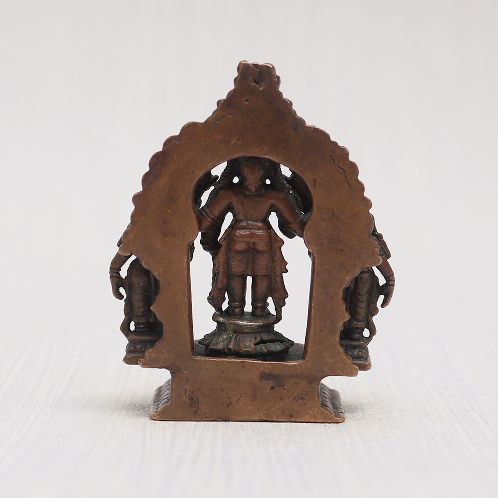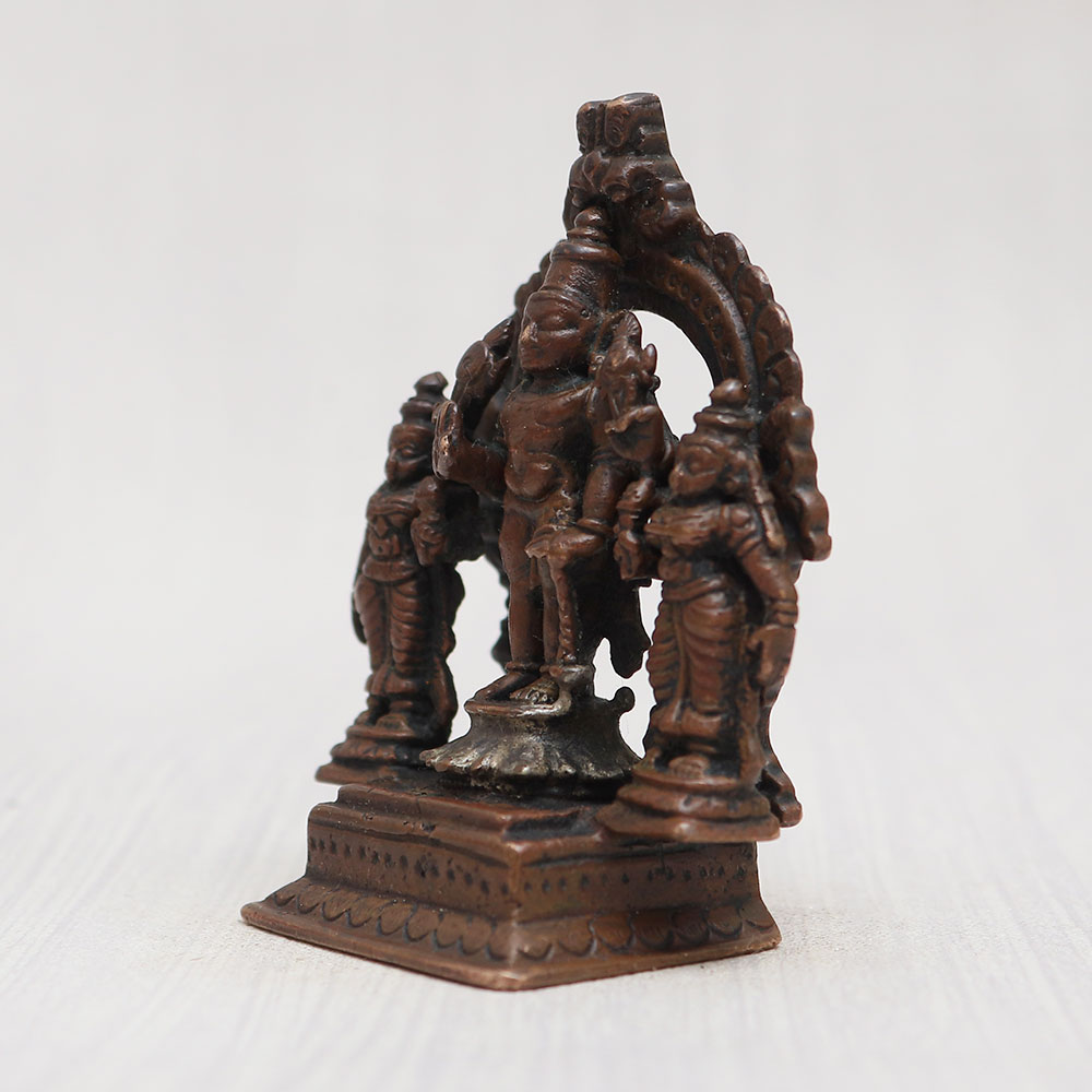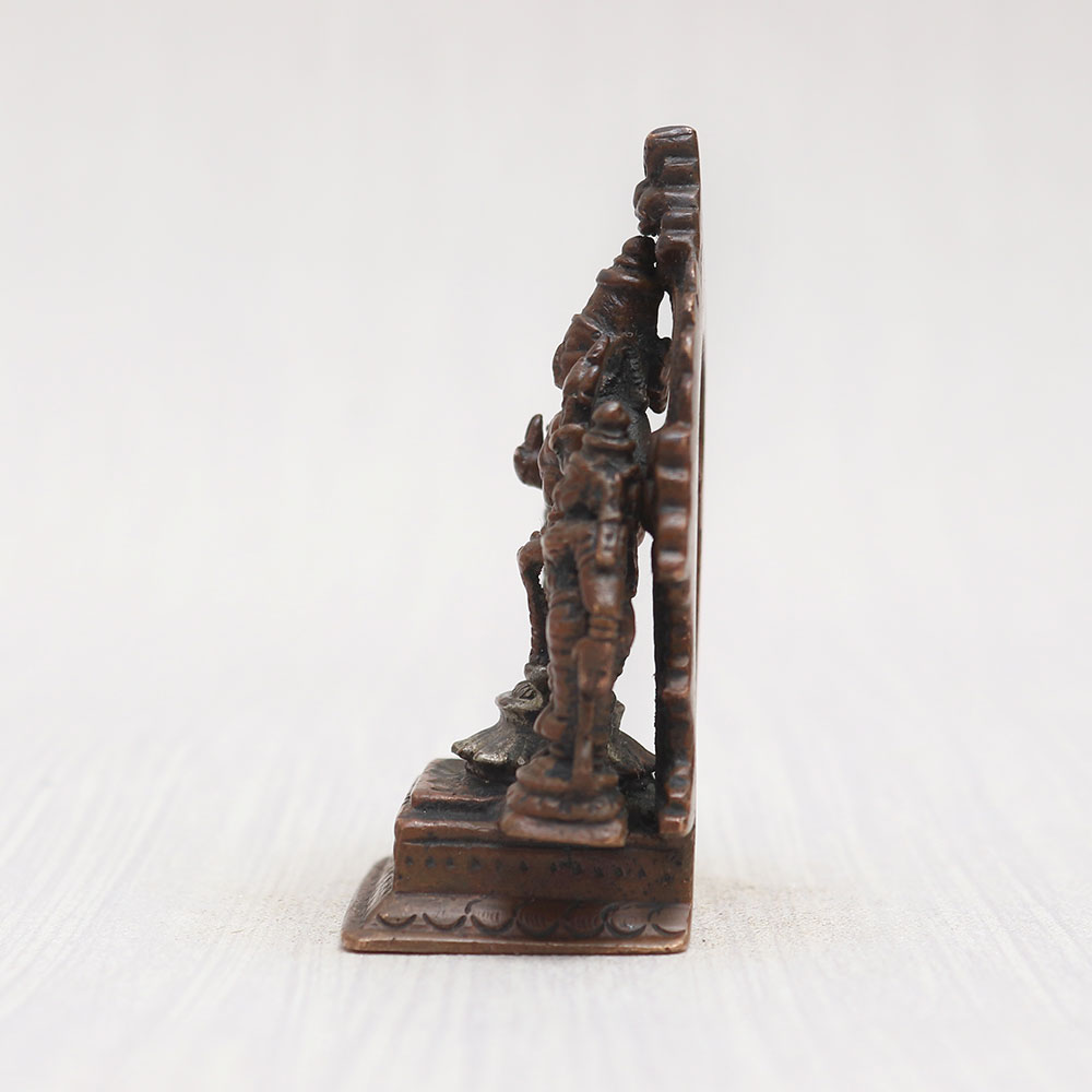 Buy a copper statue of Lord Srinivasa online that depicts Lord Srinivasa standing graciously with his celestial consorts Sridevi and Bhudevi on a meticulously crafted platform adorned with a resplendent prabhavali. Handmade by professional Indian artisans using high-quality copper, this statue exudes elegance with its vintage-style finish. A perfect addition to your prayer room at home, office, restaurant, cafe, or shop, it captivates with its eye-catching detailing, making it a must-have for exhibitions, decorations, and collections. Experience the divine aura it brings to your space as you buy idols online. Moreover, it serves as an auspicious gift for your loved ones on special, festive, or auspicious occasions, spreading blessings and joy.