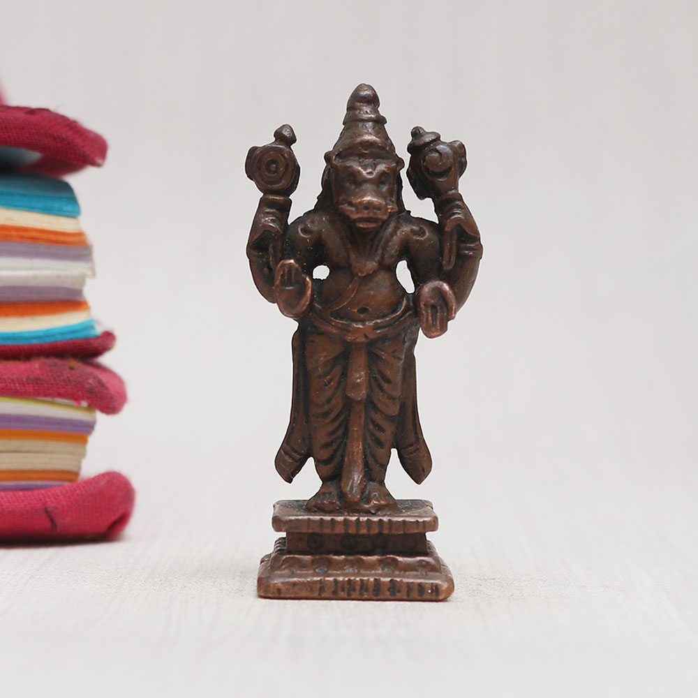 This copper statue of Lord Varaha is an incarnation of Lord Vishnu, skillfully crafted by talented Indian artisans using high-quality copper. Standing gracefully on a platform, this divine masterpiece showcases the mesmerizing vintage-style finish that adds an aura of timeless charm to any setting. This god sculpture is a perfect addition to your prayer room at home, office, restaurant, cafe, or shop, infusing the space with spiritual energy. The captivating detailing of the deity is truly eye-catching, making it an ideal item for exhibitions, decorations, and collections. As a sacred piece, this murti can be reverently placed in temples for worship, inviting divine blessings and grace. Its significance and beauty make it an ideal gift for your loved ones on special, festive, or auspicious occasions, symbolizing your wishes for their well-being and spiritual growth.