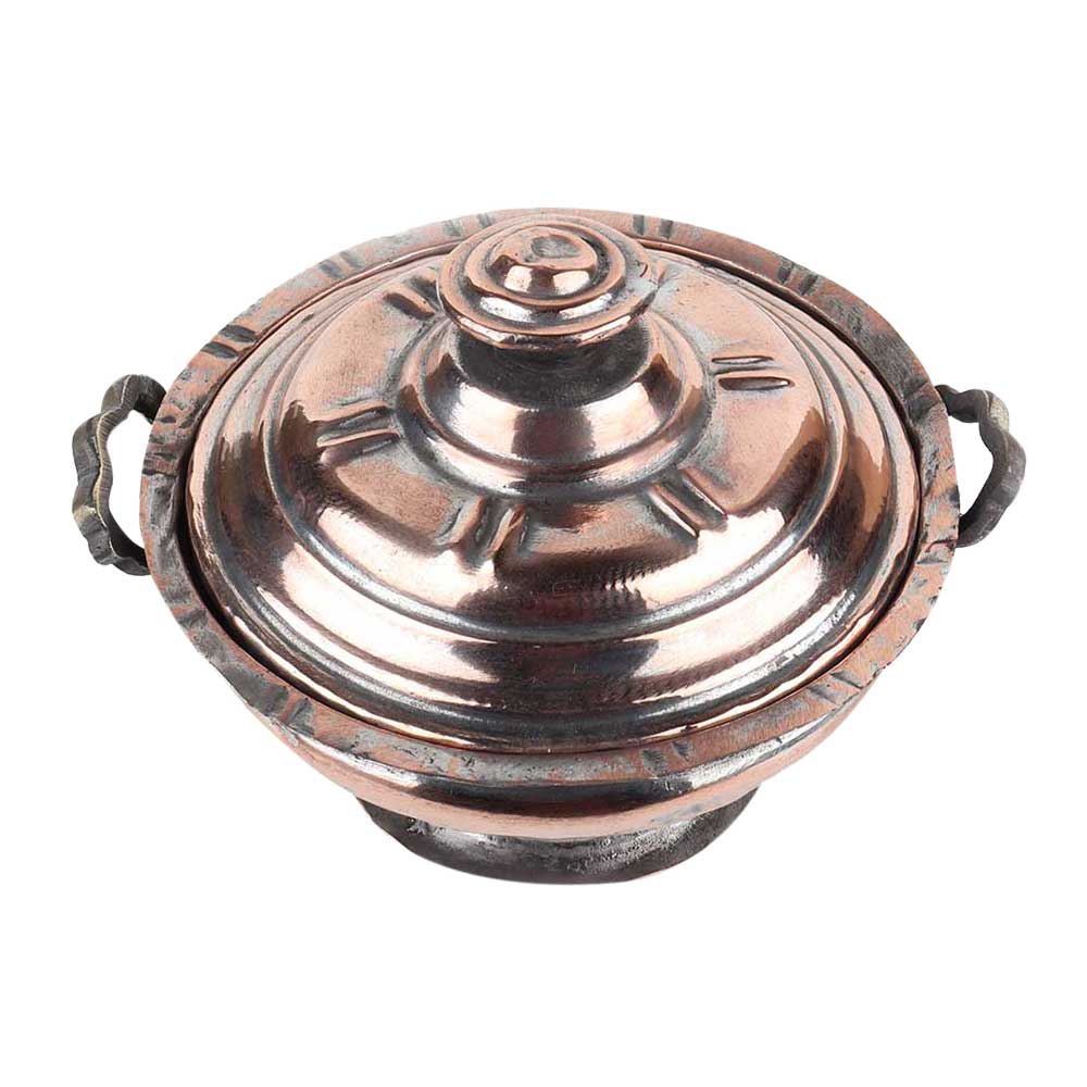 Handmade copper sugar bowl with a simple design lid and a stand with a circular base. It has handles on two sides and comes with a smooth finish .Use it yourself or use it to gift to your near and dear ones on festivals and important functions. You can also use it as a corporate gift.