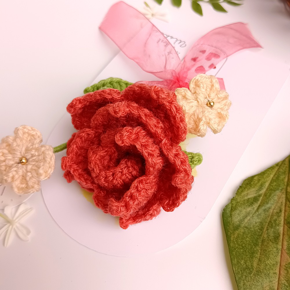 • Handmade Coral Crochet Rose With Ivory Accent