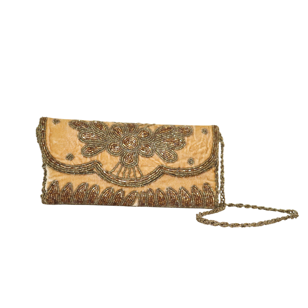 This exquisite handmade cotton clutch adorned with intricate beadwork is the perfect blend of elegance and craftsmanship. Featuring a beautiful floral bead design, this piece adds a touch of sophistication to any outfit. The soft cotton material combined with the glimmering beads offers both style and durability, making it a statement accessory for weddings, evening parties, or casual outings. The detachable chain strap allows for easy hands-free use, while the compact design provides just enough space to carry your essentials, such as your phone, keys, and cards. Whether you're looking for a timeless addition to your collection or a unique gift for a loved one, this beaded clutch offers a versatile and chic choice. Handcrafted with care, this beautiful purse ensures a one-of-a-kind accessory that will stand out and complement any occasion with its timeless beauty.