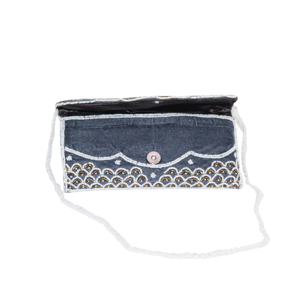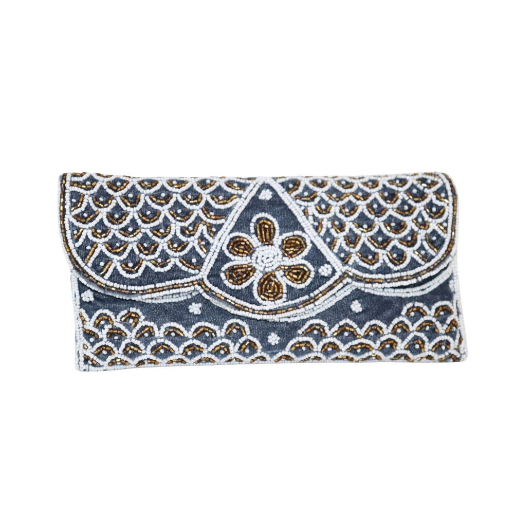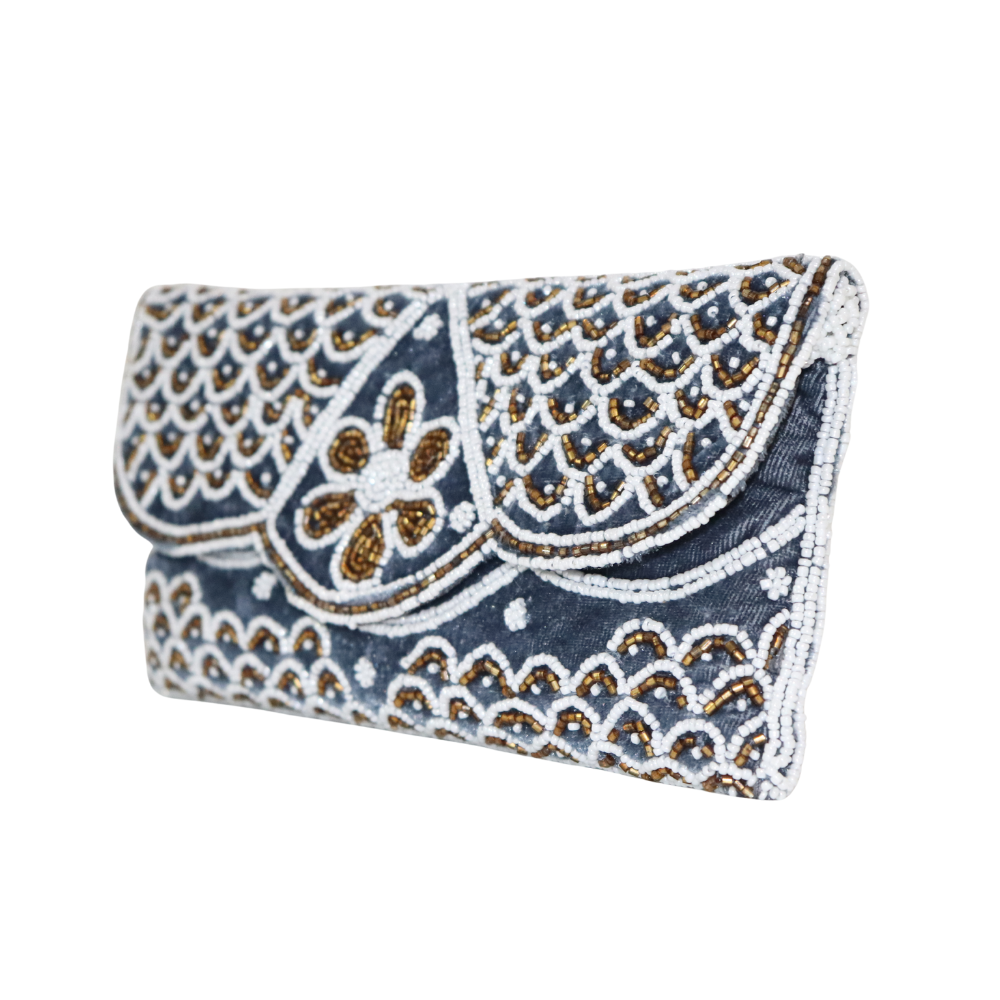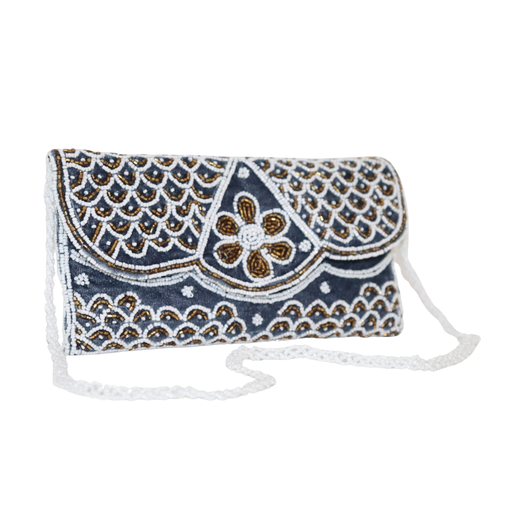Elevate your style with this stunning handmade cotton clutch, intricately decorated with beautiful beadwork. Featuring a floral design in shades of white and brown, this clutch is the perfect accessory for any special occasion. The soft cotton fabric is beautifully complemented by detailed beading, creating an elegant and timeless look. With a delicate chain strap for easy wear, this piece is both functional and fashionable, allowing you to carry your essentials effortlessly. The unique bead pattern adds a touch of sophistication, making it an ideal choice for weddings, parties, or evening events. Handcrafted with care, this clutch is a perfect blend of style, quality, and artistry. Whether you're dressing up for a formal event or adding a chic touch to a more casual outfit, this clutch is sure to make a statement.