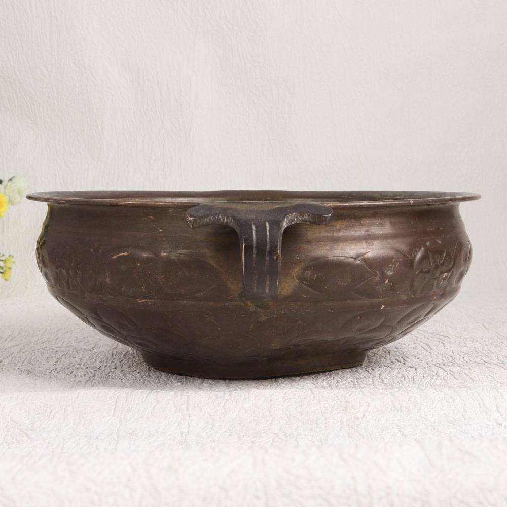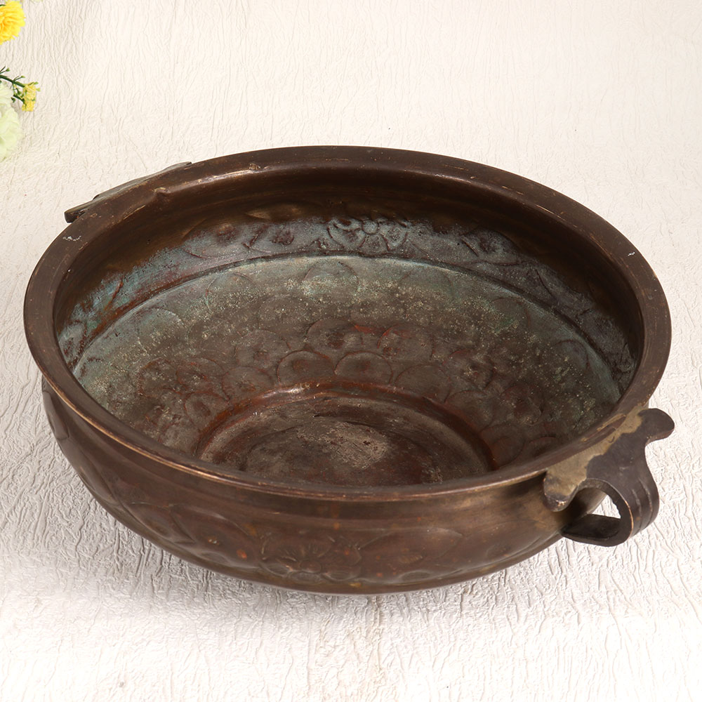 Buy a Vintage Brass Urli online from our website and get a hassle free delivery right at your doorstep. This exquisite artefact is handcrafted by highly skilled and experienced Indian artisans from high-quality brass and has an antique brown finish that adds a touch of rustic sophistication to any setting. With its graceful design and two intricately engraved handles, this Urli transports you to a bygone era of opulence and refinement. The Vintage Brass Urli serves as a versatile decor piece, perfect for elevating the ambiance of your home, office, restaurant, hotel, cafe, or shop. When filled with water and adorned with delicate flowers, it transforms into a captivating centerpiece, infusing tranquillity and beauty into your surroundings. The shimmering water reflects the bloom's vibrancy, creating a visual spectacle that is both calming and visually arresting. This Urli isn't just a decoration, it's a collector's dream. A testament to India's rich cultural heritage, it can be proudly added to your vintage collection. Moreover, it makes for a thoughtful and memorable gift for your loved ones on special, festive, or auspicious occasions.