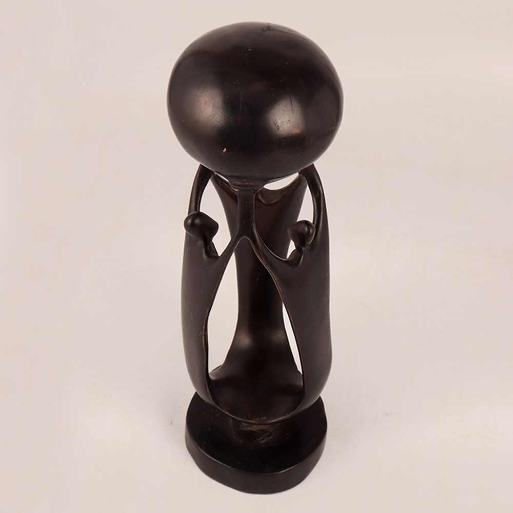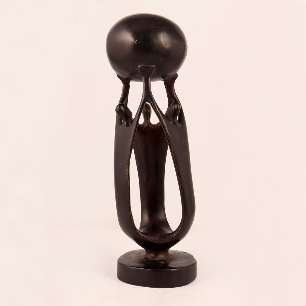 A meticulously handcrafted wood statue featuring three imposing male figures supporting a colossal sphere atop, all in an exquisite antique dark brown finish. Crafted by skilled artisans with an unwavering dedication to their craft, this statue represents the harmonious blend of tradition, artistry, and culture. Standing as a testament to the rich heritage of African craftsmanship, this striking wooden sculpture offers a unique opportunity to infuse your space with both history and beauty. Its versatile design seamlessly integrates into a variety of settings, including homes, offices, restaurants, hotels, cafes, or shops. Whether you're decorating a contemporary space or seeking to enhance a vintage collection, this statue effortlessly bridges the gap between old-world charm and modern aesthetics. For collectors with a penchant for timeless treasures, this wood statue is a must-have addition. Its cultural significance and exceptional craftsmanship make it a remarkable centerpiece. Moreover, it's a thoughtful gift option, perfect for surprising your loved ones on special, festive, or auspicious occasions. Present this piece of art to convey your appreciation and admiration, or simply to add a touch of African heritage to their lives.
