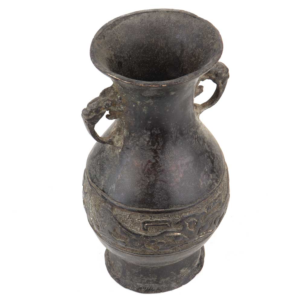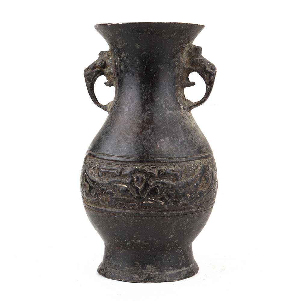 • Handmade Dark Patina Asian Brass Vase With Decorative Handles