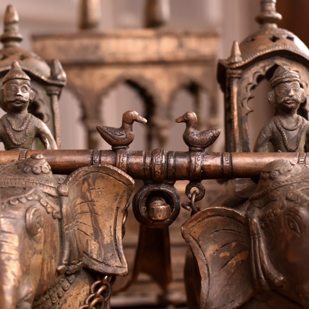The Brass Elephant Chariot is a mesmerizing piece of art that beautifully captures the essence of elegance and grandeur. Crafted with meticulous attention to detail, this stunning chariot showcases two majestic elephants, each with four exquisitely carved wheels. The elephants are attached to a cart, also adorned with four wheels, creating a harmonious and captivating design. Handmade by highly skilled Indian artisans, the chariot boasts a remarkable antique brown finish that enhances its timeless appeal. Constructed from high-quality brass, this chariot exudes durability and charm. Its intricate craftsmanship and intricate details make it a true masterpiece that demands attention. The versatility of this brass elephant chariot is unmatched. It serves as a magnificent decorative piece for various settings, including homes, offices, restaurants, hotels, and cafes. Whether displayed at an exhibition or showcased in a museum, it effortlessly captivates viewers with its artistic brilliance. Moreover, the brass elephant chariot makes for an incredible gift choice for your loved ones on special, festive, and auspicious occasions. It symbolizes good luck, prosperity, and strength, making it a thoughtful and meaningful present that will be cherished for a lifetime.