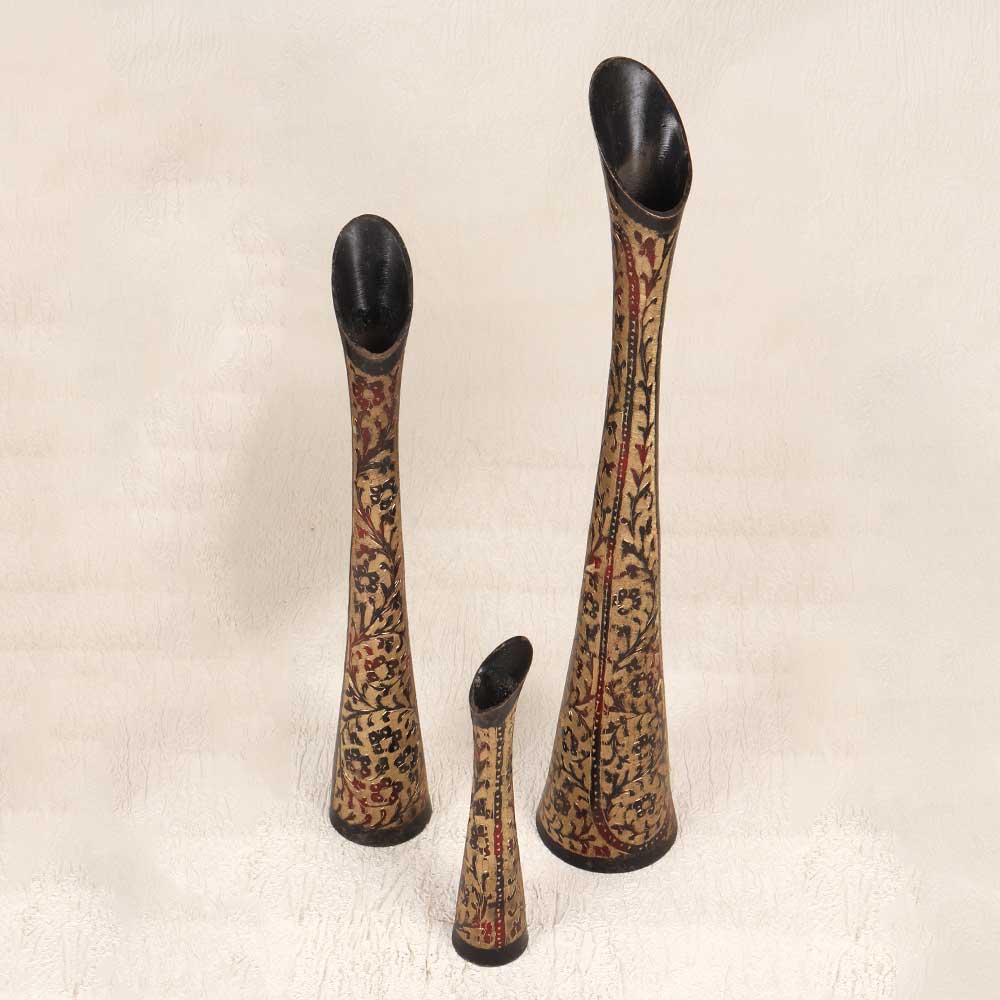 Bring a timeless elegance to your home with this stunning set of 3 vintage brass flower pots. Crafted from high-quality brass in Hyderabad, India, these pots feature intricate hand-engraved patterns for a one-of-a-kind antique look. With their eye-catching engraved detailing, these pots are sure to be the focal point of any room. The largest pot looks gorgeous as a standalone floor vase, while the smaller pots can hold petite blooms on shelves, mantles or side tables. The warm glow of the brass pairs beautifully with both modern and traditional decor. For plant lovers and interior design enthusiasts alike, these vintage brass pots are a stylish way to display your greenery. The breathable brass material provides healthy drainage and air flow for plants. Give your home an instant antique aesthetic with these one-of-a-kind accent pieces crafted with care in India.