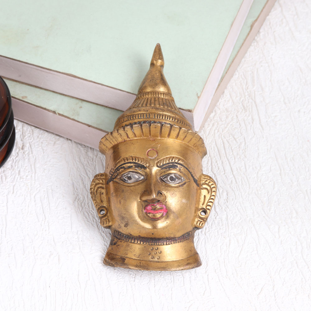 Buy a Vintage Brass Goddess Parvati Head Plate online and get a hassle free delivery right at your doorstep. Handcrafted with meticulous precision by talented Indian artisans, this piece showcases the rich heritage and craftsmanship of India. The head plate features intricate detailing in a stunning antique brown finish, exuding an aura of vintage charm. The eyes of Goddess Parvati are adorned with shimmering silver, adding a captivating allure to this sacred creation. Versatile in its application, this artisanal masterpiece can grace your home, office, restaurant, hotel, cafe, or shop, enhancing the ambiance with its ethereal presence. Whether you seek a divine focal point for prayer or an artful decoration, this plate serves both purposes with grace and reverence. Furthermore, collectors and enthusiasts can consider adding this piece to their vintage collection or proudly display it at exhibitions, where its craftsmanship and beauty can be truly appreciated. As a thoughtful gesture, this Goddess Parvati head plate makes for a meaningful gift on special, festive, or auspicious occasions, embodying the spirit of timeless devotion and artistry.