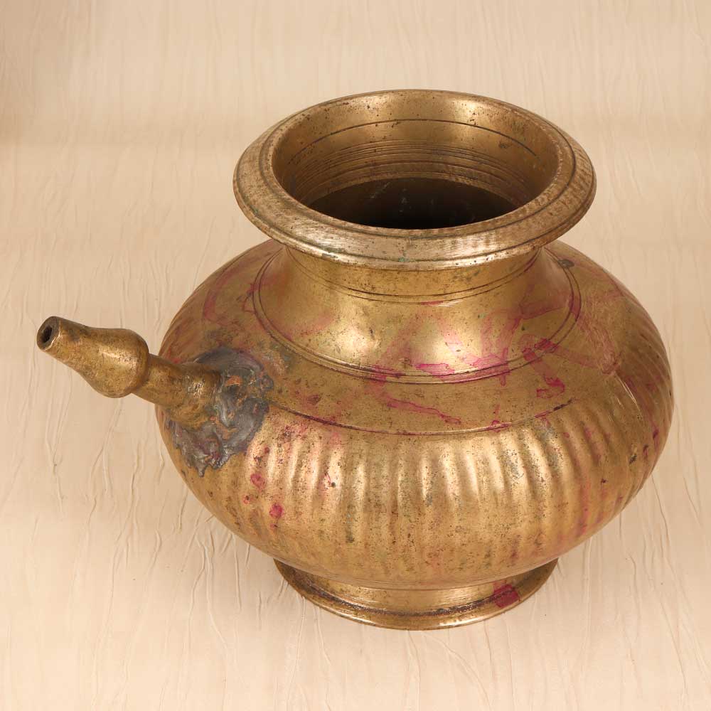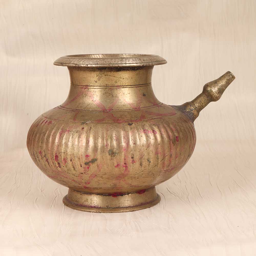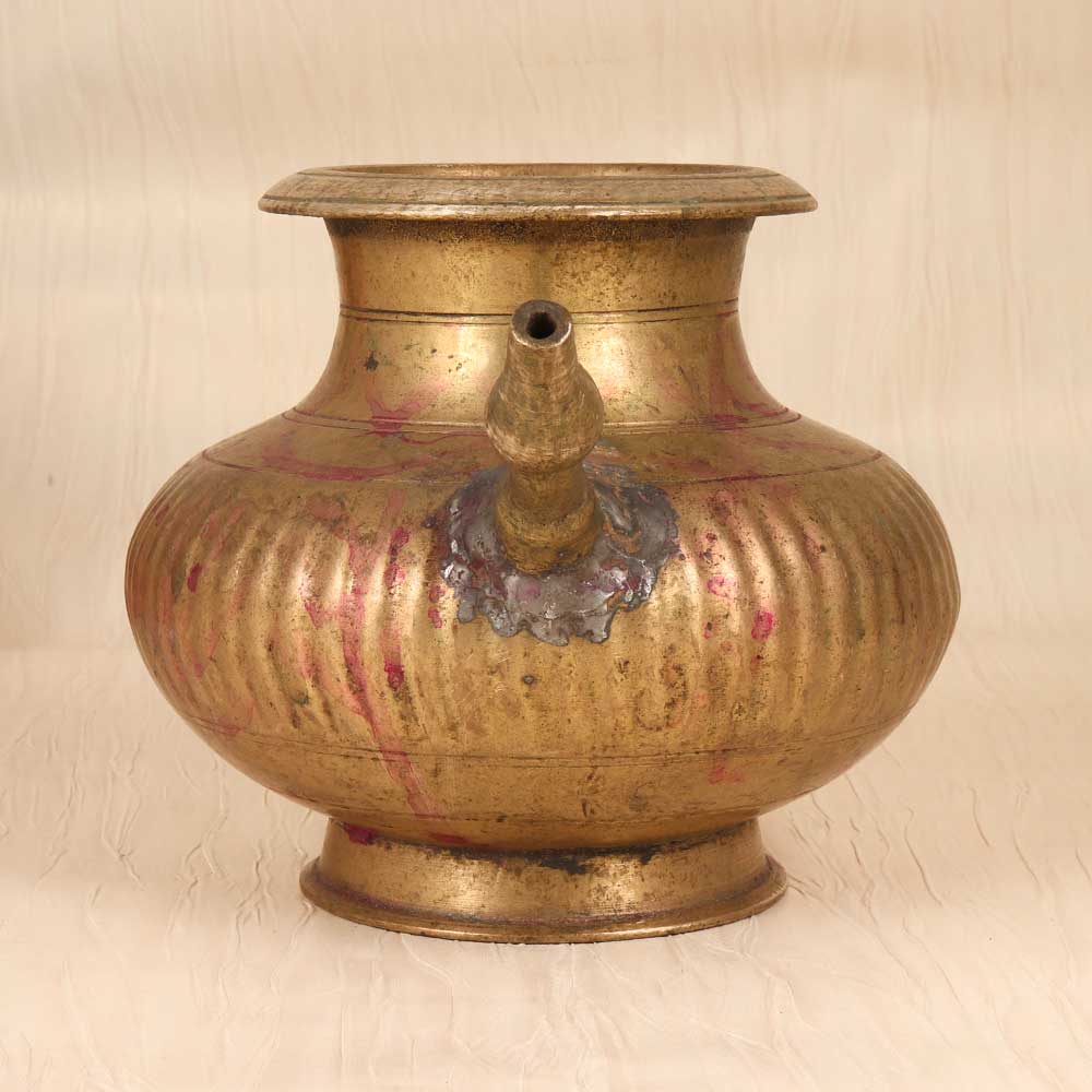 Immerse yourself in antiquity with this vintage brass holy water pot. Lovingly crafted in Central India with intricate designs and a spout for easy pouring, this pot will transport you to simpler times of faith and tradition. Bring a touch of the spiritual to your home decor with this brass pot that beautifully displays holy water. Place it on your home altar, bookshelf or side table to complement your vintage-inspired space. The pot's charming simplicity and aged patina add warmth and character wherever it's displayed. Give the gift of tradition to the religious person in your life. This pot is perfect for people of faith who want a meaningful, everyday object to connect them to their beliefs. It's sure to become their go-to vessel for holy water in their home or place of worship.