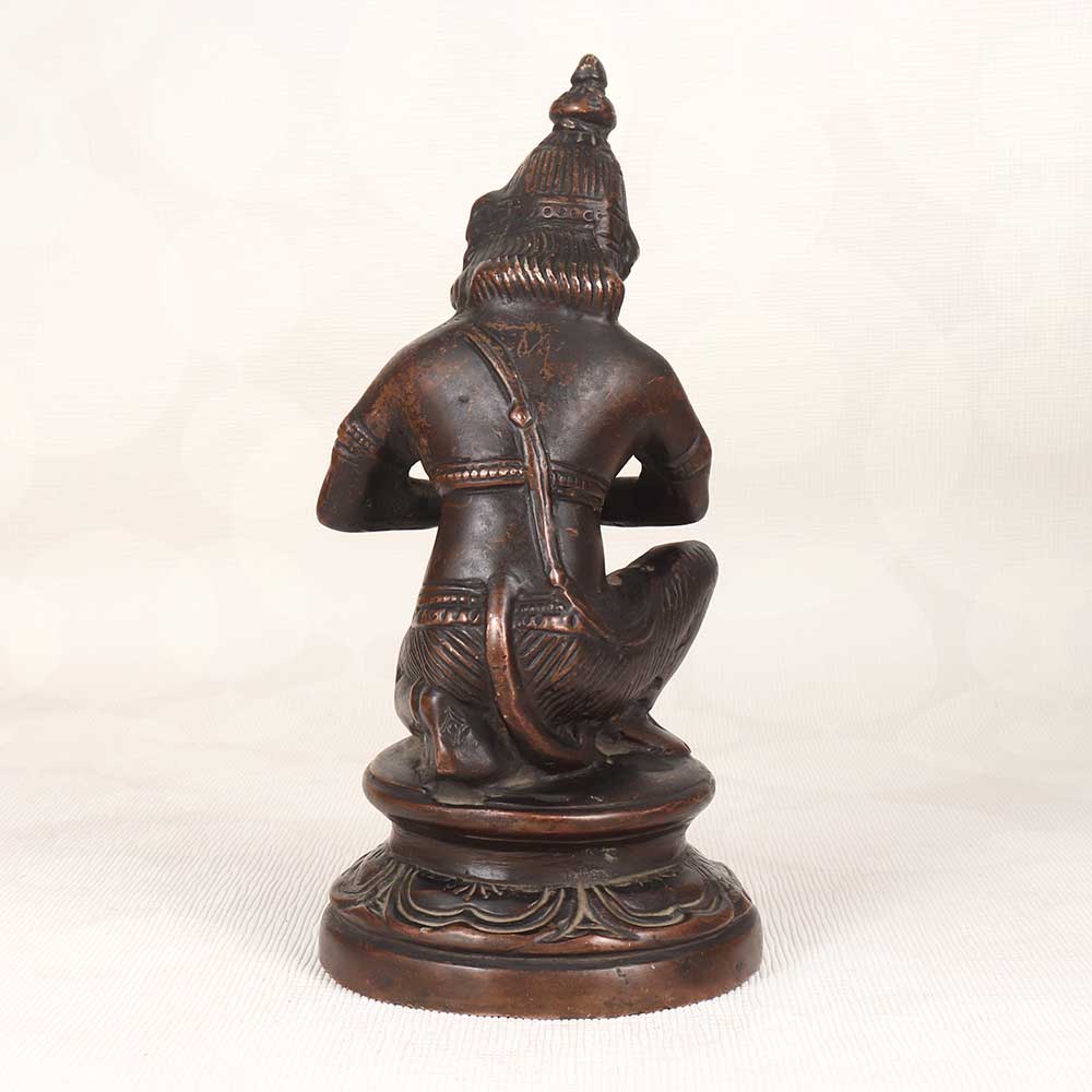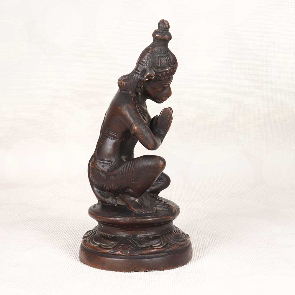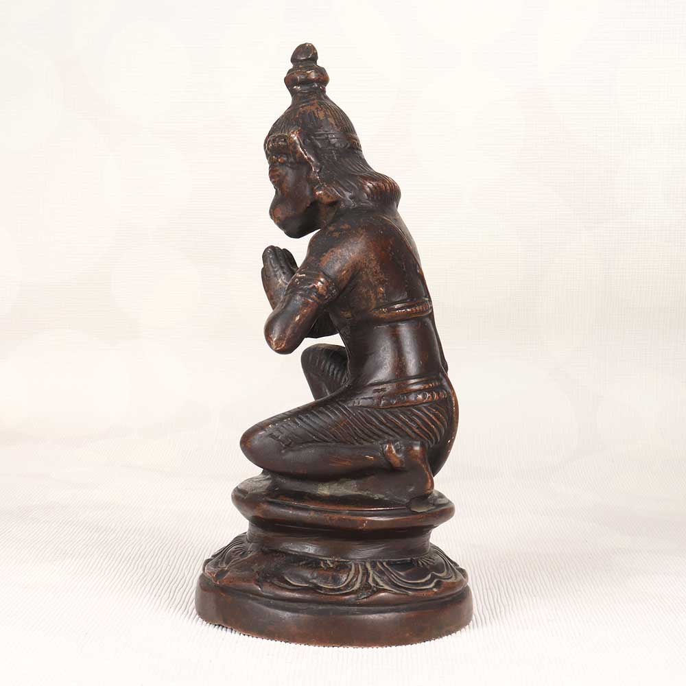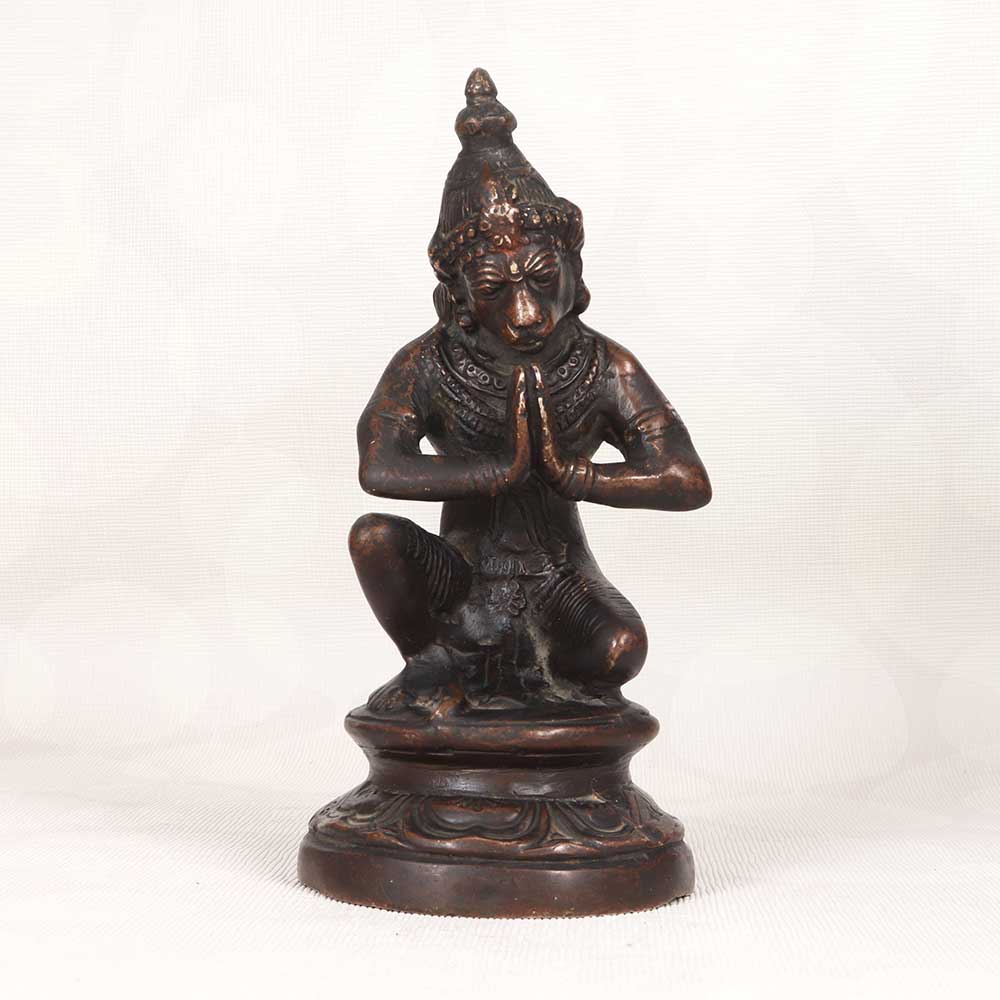 Bring the divine blessings of Lord Hanuman into your home with this exquisite vintage brass Hanuman statue. Crafted with intricate detail, this statue depicts Hanuman in a seated namaskar mudra pose with a serene expression that radiates peace. This beautifully crafted brass Hanuman murti will add spiritual resonance to any room. The fine details like Hanuman's crown, jewelry, facial features, and pose are an artistic delight. As one of the most beloved Hindu deities, Hanuman stands for strength, devotion, and protection. Keeping his image in your home is believed to remove obstacles and bring in positivity. This vintage brass Hanuman statue makes for a unique gift for Hindus worldwide. Bless your friends or family by gifting them this divine statue that evokes tradition and auspiciousness. Its timeless appeal means it can be passed down generations.