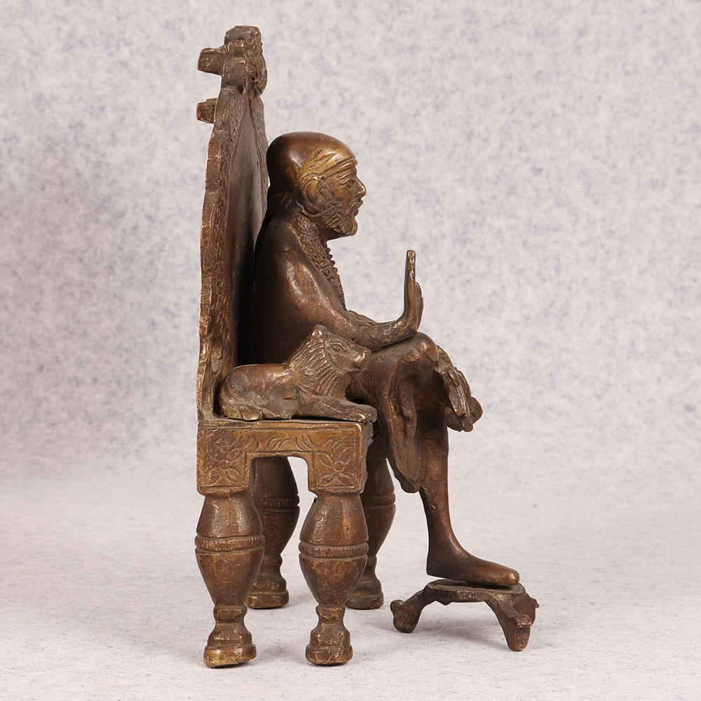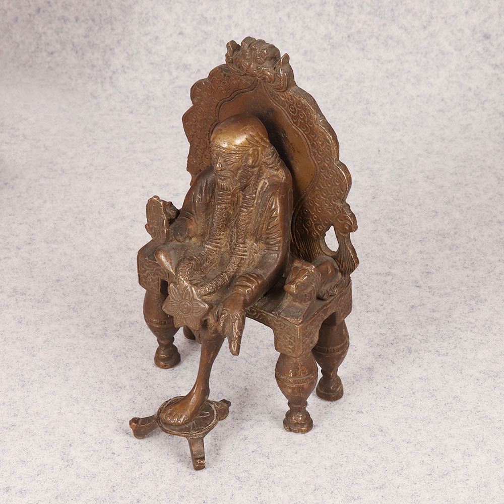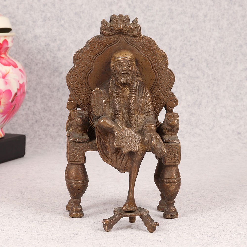 A Brass Statue of Sai Baba that is a masterpiece crafted by highly skilled Indian artisans with unwavering dedication and precision. Seated gracefully on a regal throne, Sai Baba emanates an aura of tranquillity and divine energy, making it a perfect addition to any sacred space. The intricately designed Prabhavali behind him enhances the spiritual ambiance, symbolizing divine protection and radiance. This exceptional statue boasts a distinctive dark finish, adding an element of timelessness and sophistication. Handmade from high-quality brass, the craftsmanship reflects the rich heritage and artistic prowess of India. Versatile in its placement, this divine creation finds its perfect spot in homes, offices, restaurants, hotels, cafes, or prayer rooms. Its presence not only elevates the aesthetic appeal of any space but also fosters an environment of serenity and spiritual connection. An ideal addition to vintage collections, this brass statue serves as a thoughtful and meaningful gift for loved ones on special, festive, or auspicious occasions.