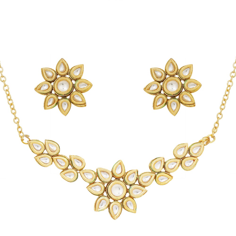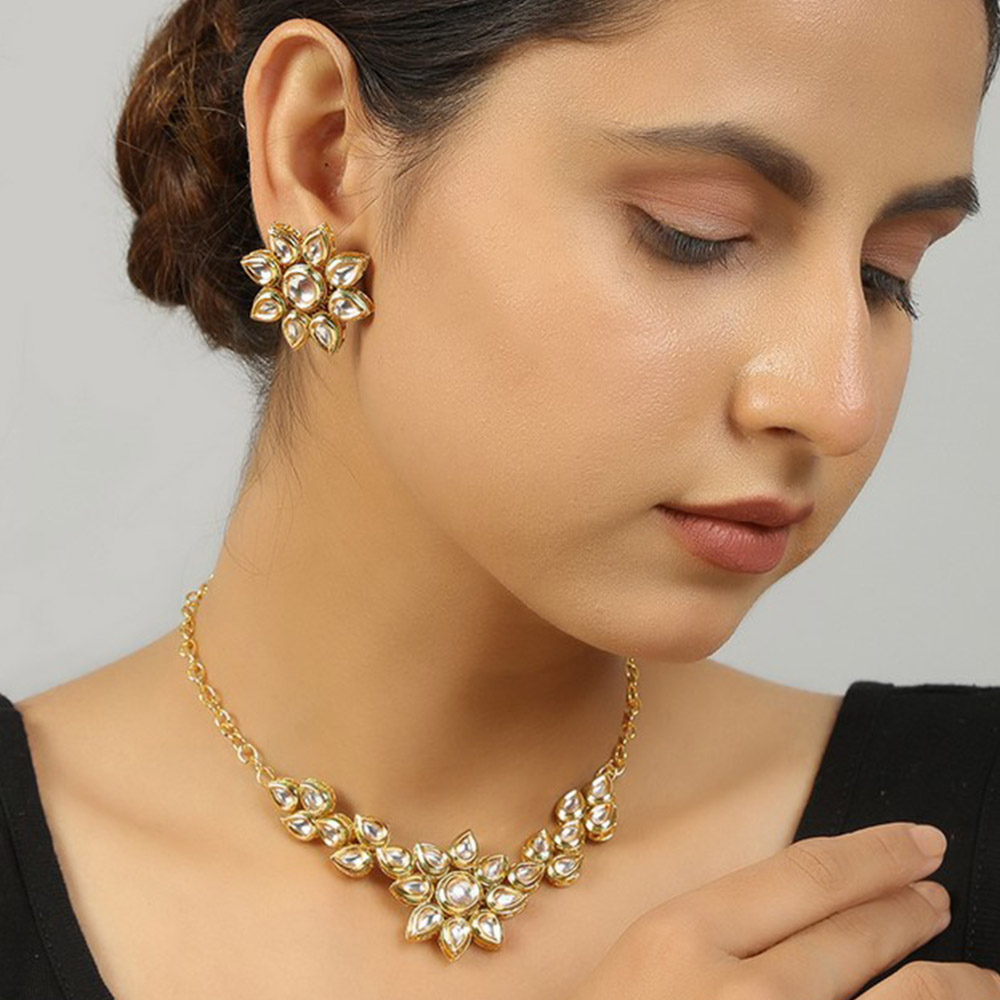 The Handmade Floral Kundan Necklace with Earrings is a delicate tribute to traditional Indian craftsmanship. Crafted in brass with a luminous gold tone finish, this 14-inch necklace sits gracefully along the neckline, highlighting intricate floral kundan detailing. Soft white accents enhance the golden base, creating a refined balance of brilliance and grace. Paired with matching earrings, the set offers a cohesive and elegant statement for festive and ceremonial occasions.