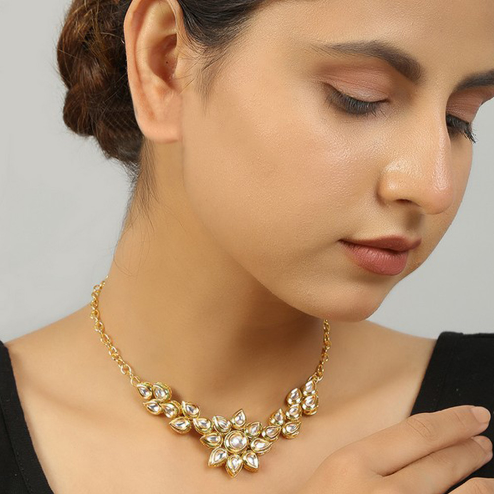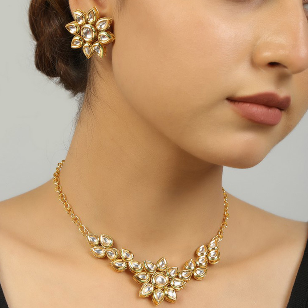 Celebrate individuality with our handcrafted 14-Inch Floral Kundan Necklace with Earrings. This exquisite set features a floral kundan necklace and matching earrings, perfect for bridal ensembles, festive occasions, and meaningful gifting. Packed & quality-checked by Indianshelf.
