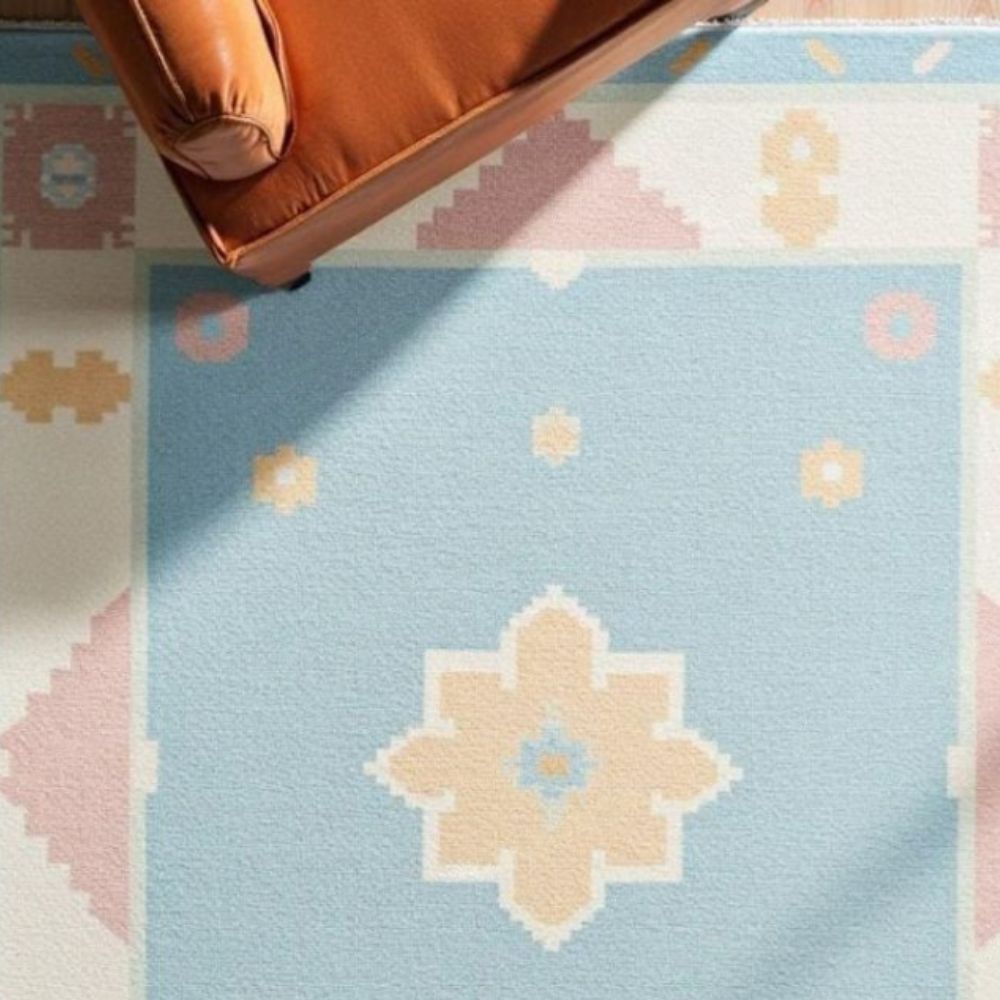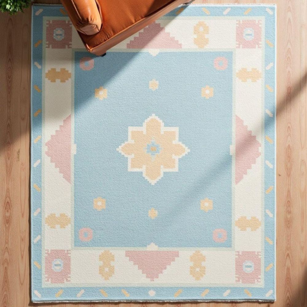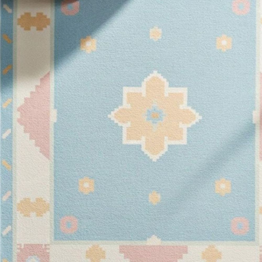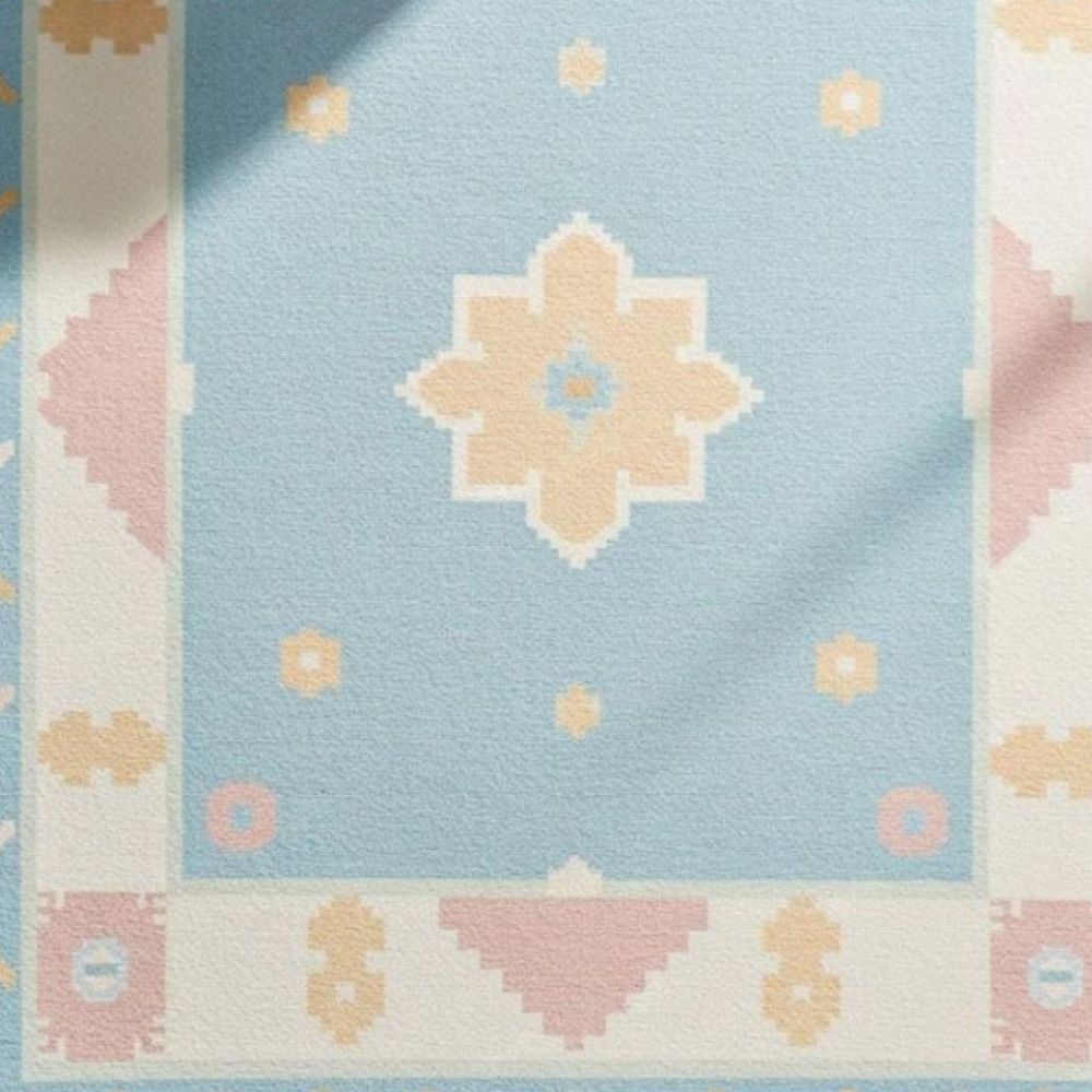 Bring a refreshing charm to your home with this pastel geometric wool rug, designed in a soothing sky-blue base accented with beige, blush pink, and cream motifs. Its central star-inspired medallion and playful border details make it a perfect blend of modern minimalism and traditional charm. Design & Pattern: Featuring pixel-like geometric motifs inspired by tribal art, reimagined in soft pastel tones for a contemporary look. Material & Process: Handwoven with care from premium wool, this rug offers both durability and natural softness underfoot. Color Palette: Gentle shades of blue, beige, cream, and pink create a calming vibe, ideal for brightening any room. Perfect For: Living rooms, nurseries, bedrooms, or creative spaces that need a soft pop of color. Customization Available: Can be made in different sizes and colors on request to perfectly match your homes interior. As it Appears Pack of One Piece.