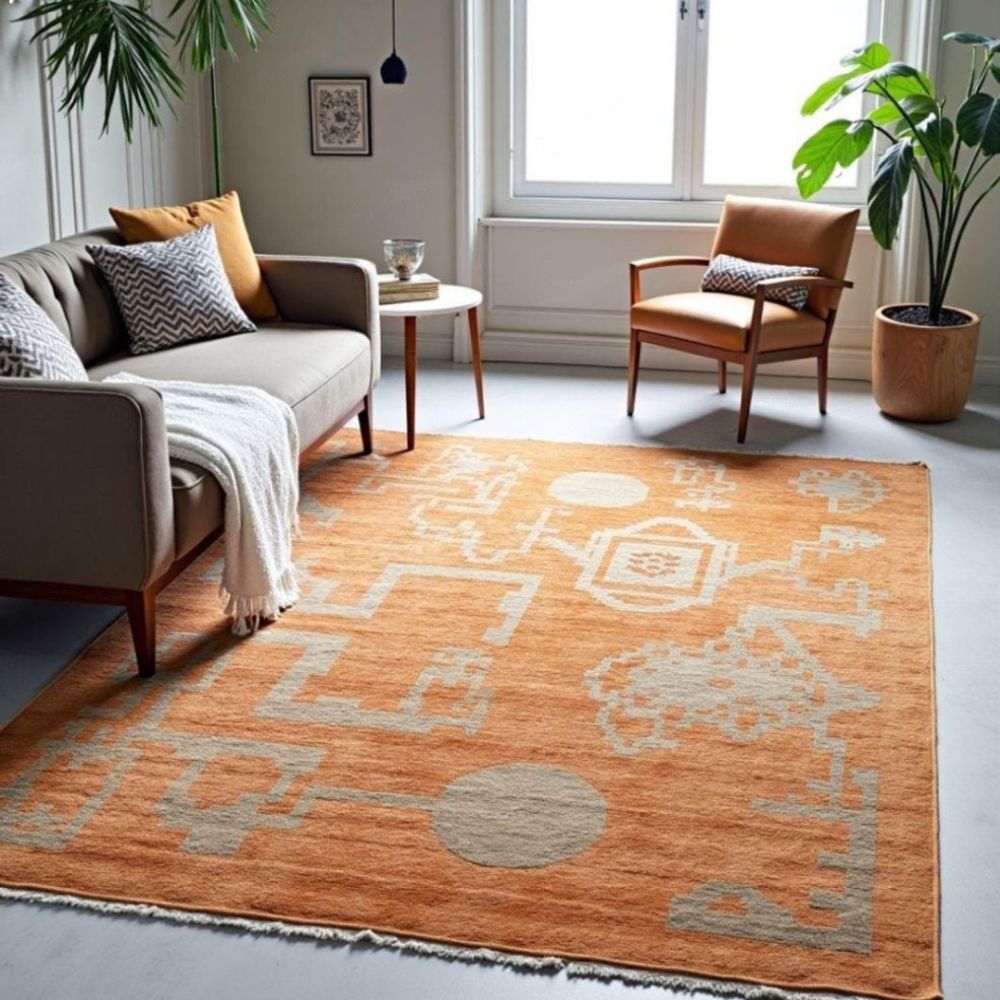 Make a bold design statement with this hand knotted modern abstract wool rug, featuring an intricate interplay of geometric shapes and artistic patterns in a warm orange and soft beige palette. The unique layout blends circles, angular forms, and traditional-inspired motifs, resulting in a rug that is both visually striking and deeply versatile. Wools insulating properties keep your space cozy, while the hand-knotted construction ensures a high-quality, heirloom-worthy piece built to last for generations. The vibrant orange base brings warmth and energy to your home, while the beige pattern adds a sophisticated, grounding element. This fusion of bold color and neutral detailing makes it an excellent fit for a variety of stylesfrom modern and contemporary to bohemian and eclectic interiors. Whether used as a focal point in your living room, under a coffee table, or in an office lounge, it instantly elevates the rooms ambiance with texture, color, and personality. Key Features: Material: 100% Hand Knotted Wool Design: Modern Abstract with Geometric Shapes Colors: Warm Orange & Soft Beige Durability: Long-lasting and naturally stain-resistant Soft Texture: Comfortable and inviting underfoot.