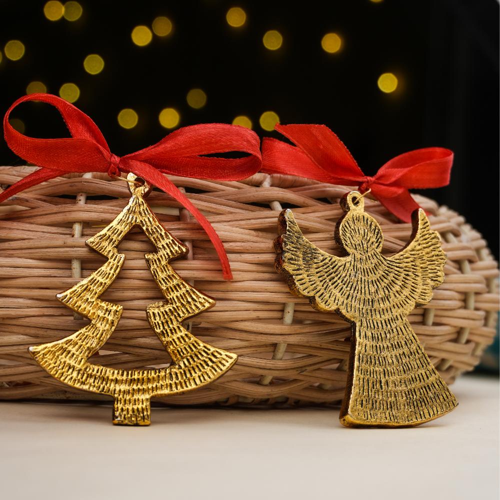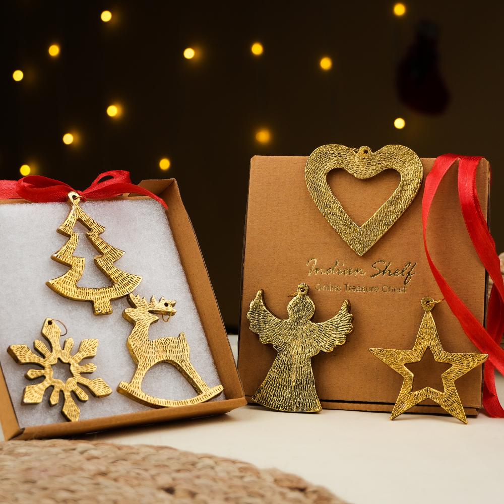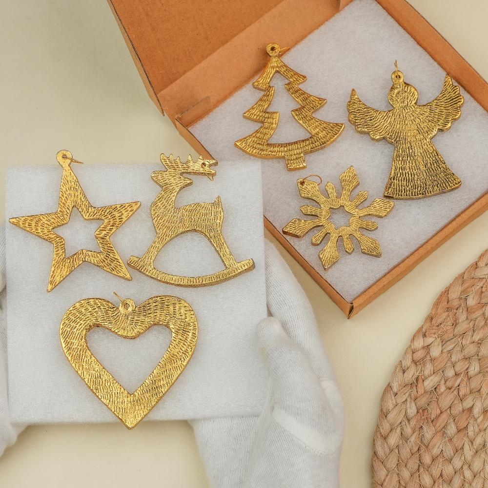 Bring festive sparkle to your Christmas celebrations with this elegant Set of 6 Aluminium Christmas Ornaments. Designed in classic holiday shapes including a snowflake, heart, Christmas tree, star, reindeer, and angel, each piece is crafted from high-quality aluminium with a golden finish. The ornaments come with bright red hanging ribbons, making them easy to display on your Christmas tree, wreaths, garlands, or as part of your holiday table décor. Lightweight yet durable, these ornaments are reusable year after year, adding timeless charm to your festive decorations. Perfect for gifting, decorating parties, or creating a warm and joyful holiday atmosphere.