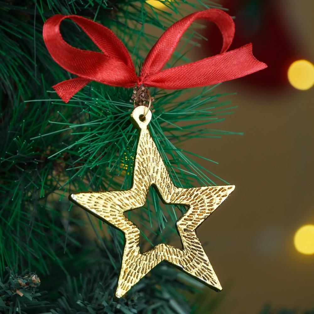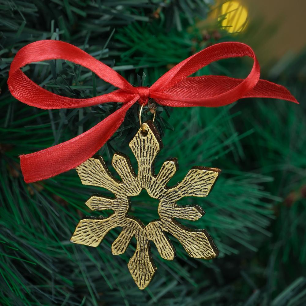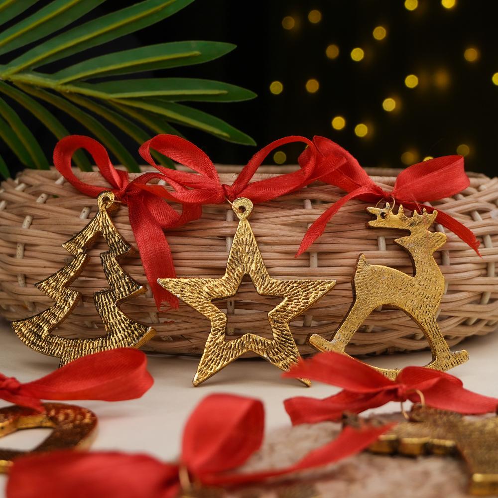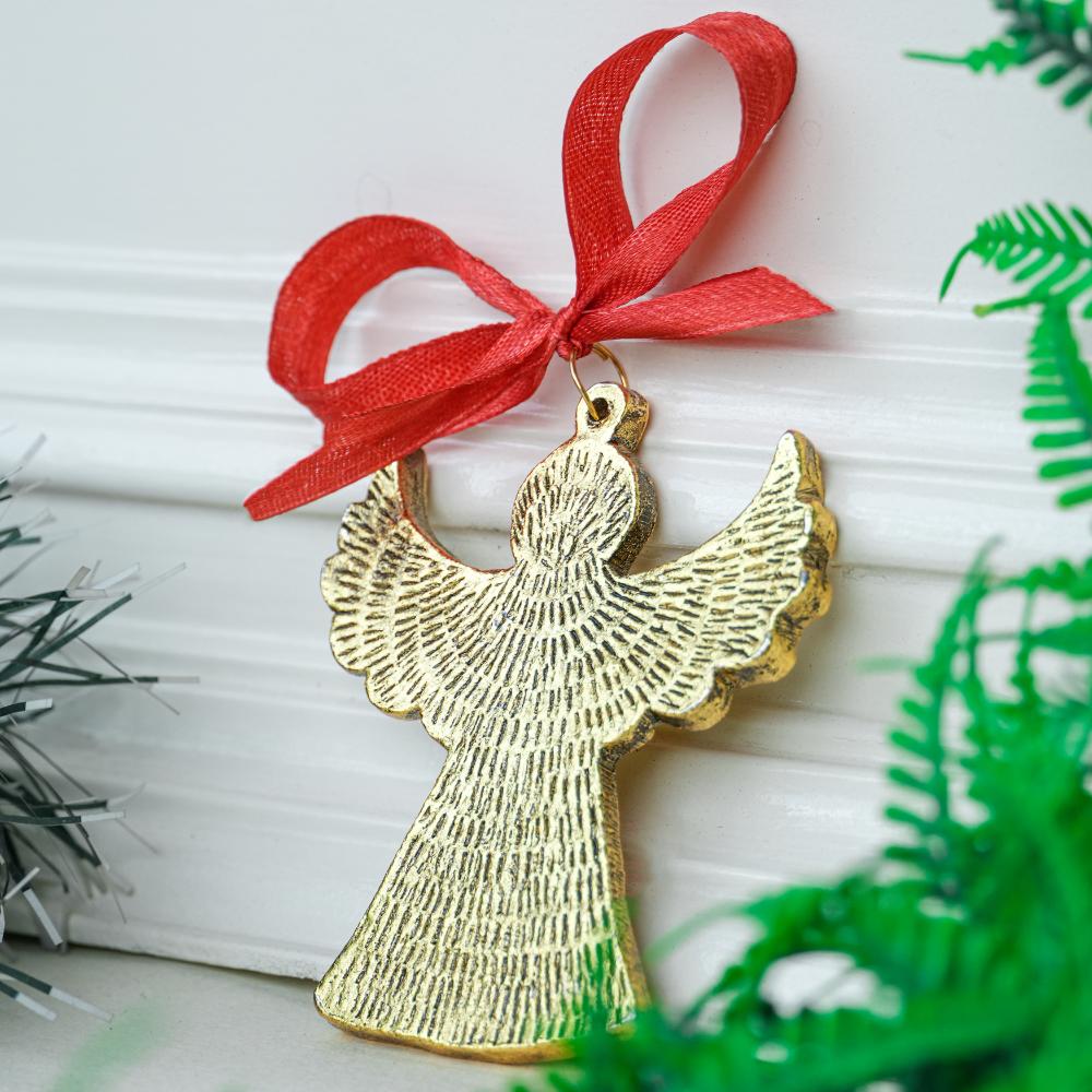 - Golden finish with red ribbons – Festive and easy to hang.
