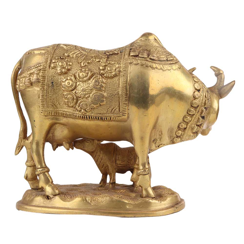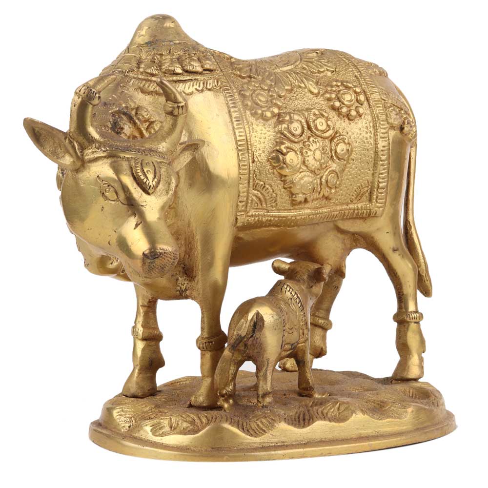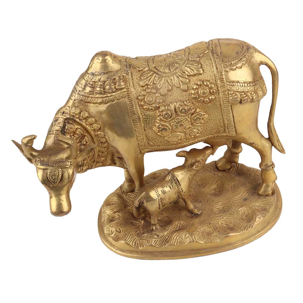 Handmade Golden Brass Kamdhenu Cow with Calf Idol is the best Gift for Marriage Anniversary, Parents, Mothers day, Wedding Return Gift, Birthday, House warming, Office / Shop Inauguration, Festive occasions - Like Diwali, Grah Pravesh and Corporate Gifts Item.