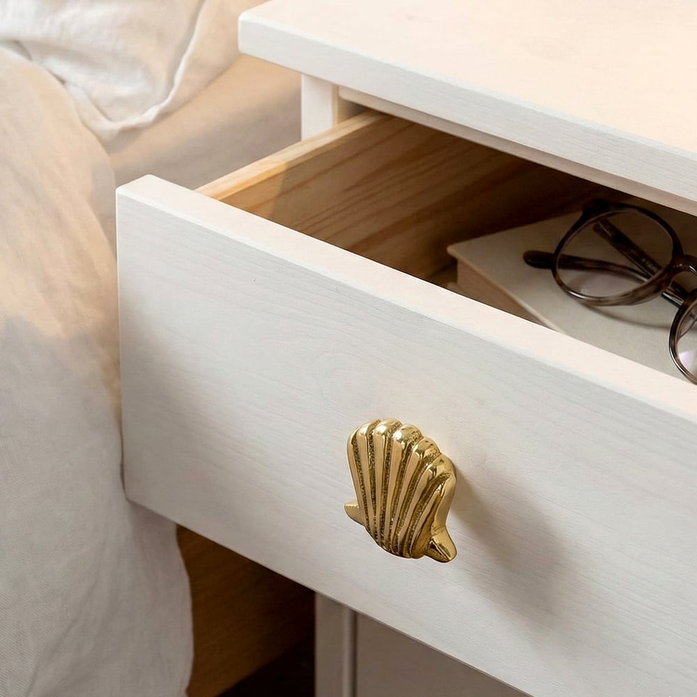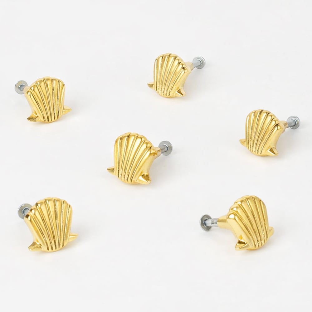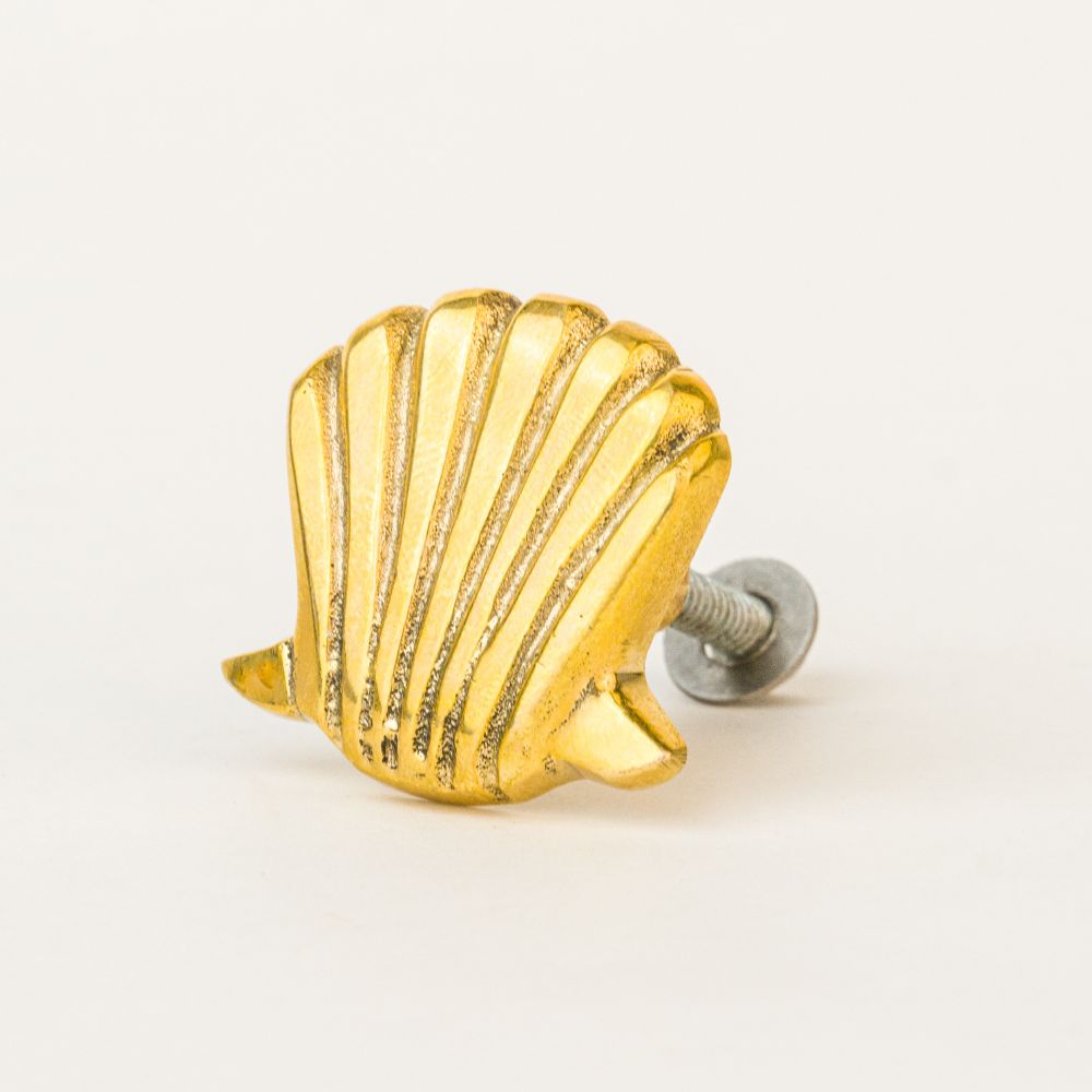 Elevate your furniture with the charm of coastal elegance through this handmade golden brass scallop shell knob. Beautifully crafted from premium solid brass, it features a smooth scallop-inspired design that adds a luxurious, oceanic touch to your interiors. The glossy golden finish enhances its visual appeal, making it a perfect accent for drawers, cabinets, and wardrobes in both modern and traditional settings.