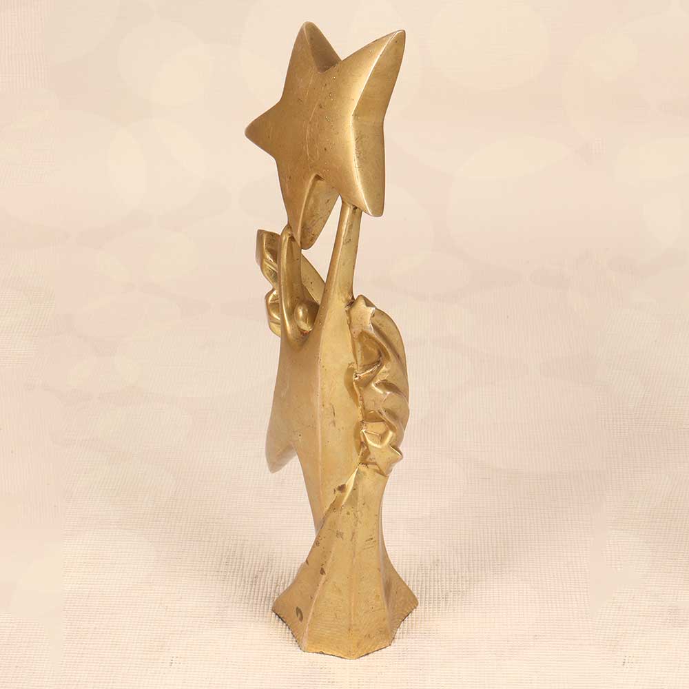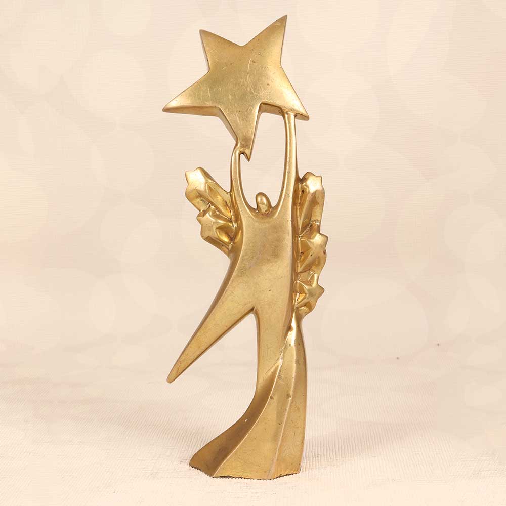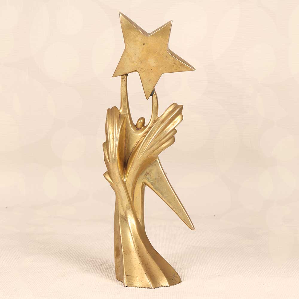 Stand out from the crowd with this elegant brass trophy featuring a golden figure holding up a shining star. This trophy makes a stunning statement and is perfect for recognizing achievements and excellence. With its unique design, this brass trophy is sure to be a treasured keepsake for any recipient. The antique brass finish gives it a timeless, distinguished look that adds gravitas and importance to any award ceremony or event. The impressive height draws eyes to the winner, while the sturdy base prevents tipping. Give an award that will stand the test of time. This brass trophy with its elegant styling is ideal for schools, businesses, teams, or events looking for a trophy that makes a statement. The winner will proudly display this award for years to come.