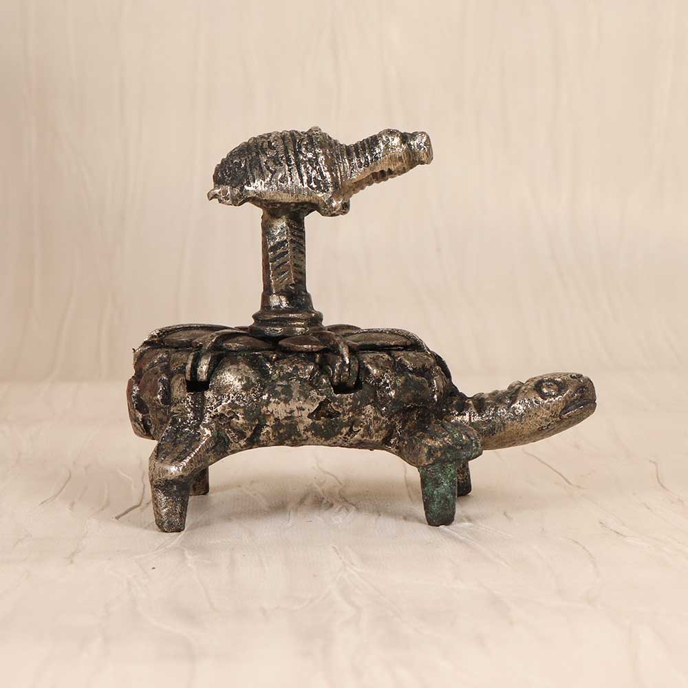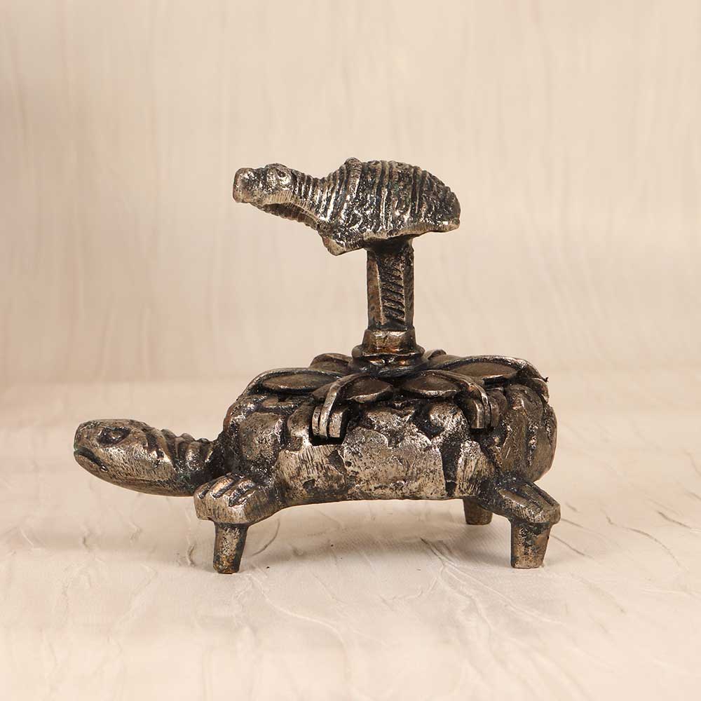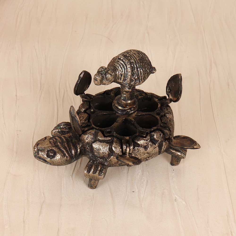 Bring an elegant vintage touch to your bindi storage with this stunning metal turtle bindi box. Crafted from durable metal with a stylish grey finish, this box features 6 compartments to neatly organize all your bindis. The unique turtle design and vintage aesthetic make this bindi box a charming addition to any dresser or vanity. This beautiful bindi box is a must-have for any bindi lover looking to organize their collection in style. The 6 compartments keep bindis of different sizes neatly separated so you can always find the one you want with ease. And the durable metal construction ensures this box will withstand daily use for years to come. Display it proudly on your dresser or vanity to infuse your space with a touch of vintage charm. For those who appreciate unique, vintage-inspired accessories, this metal turtle bindi box is a stylish storage solution. Organize your bindi collection while adding a decorative accent to your bedroom or dressing area.