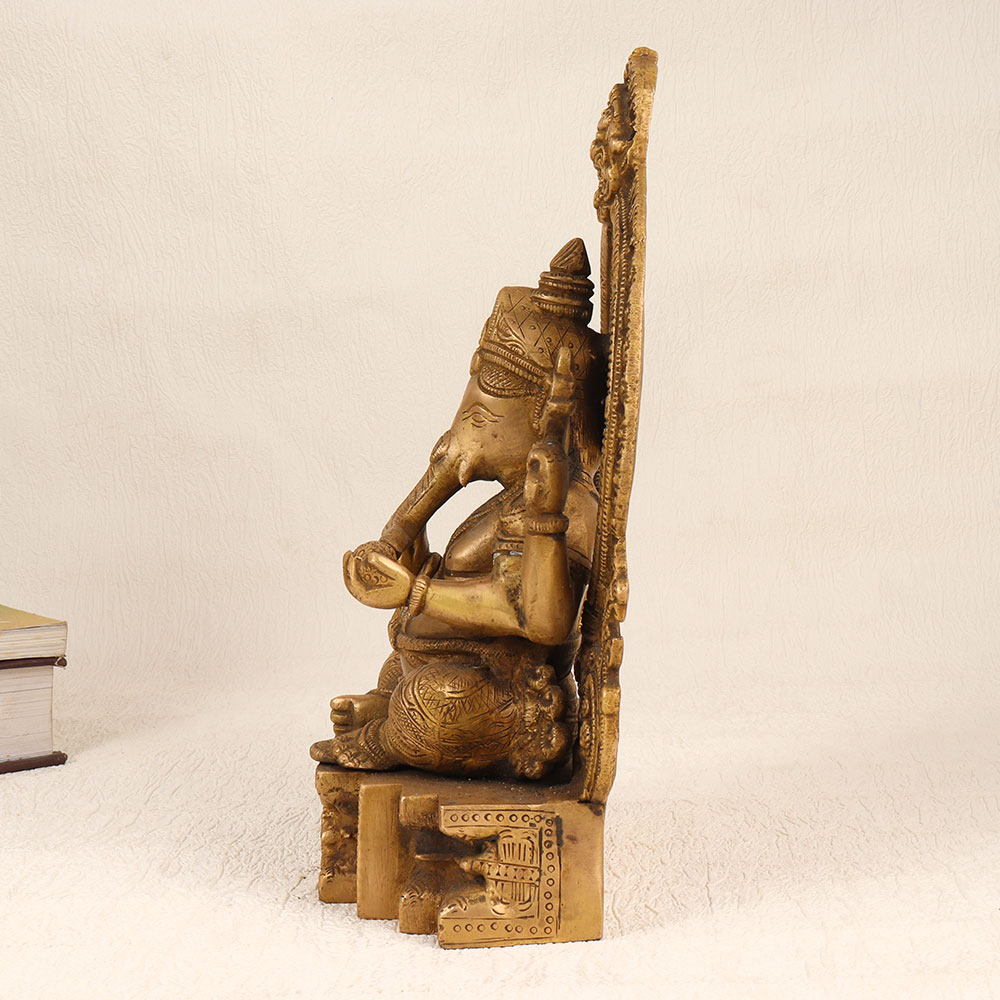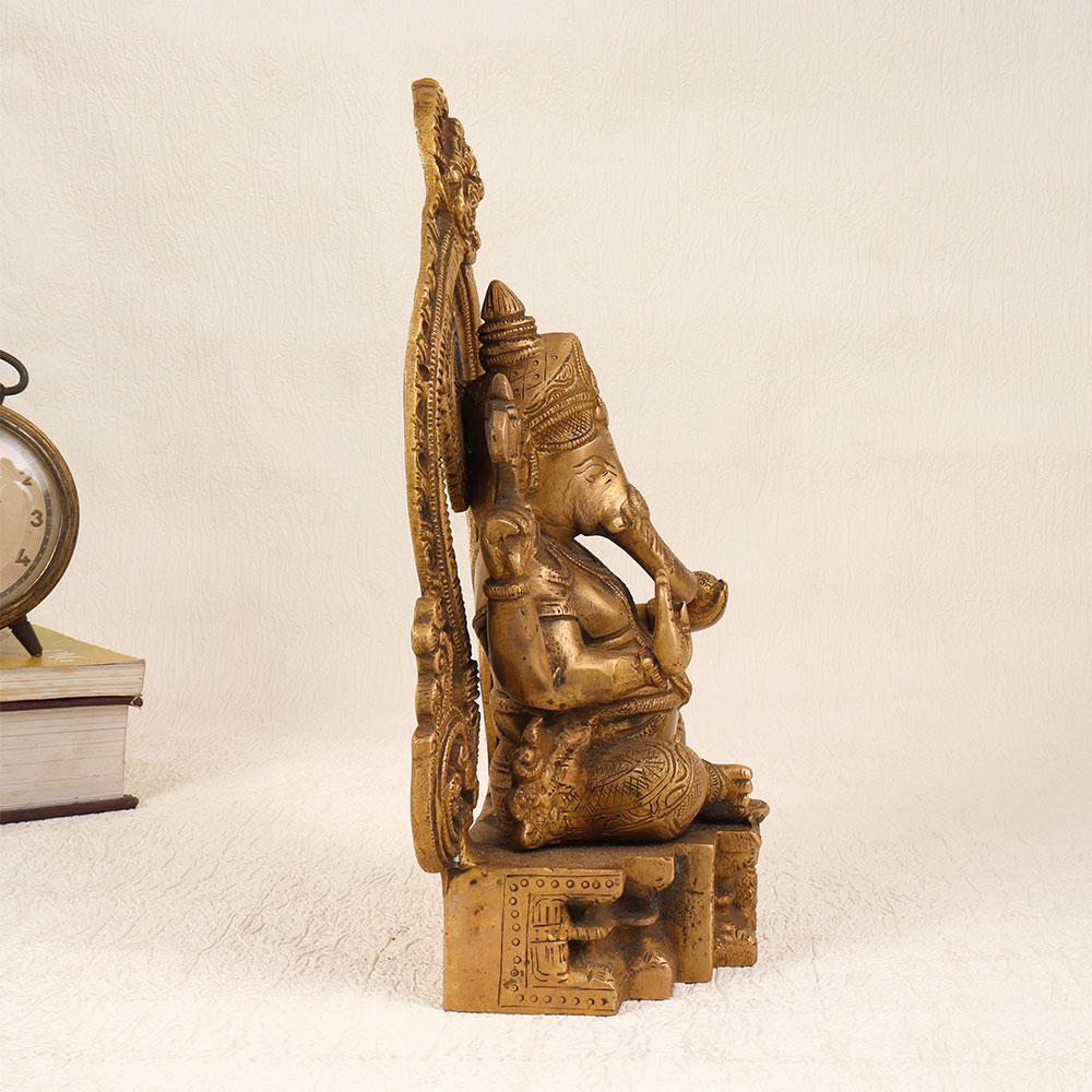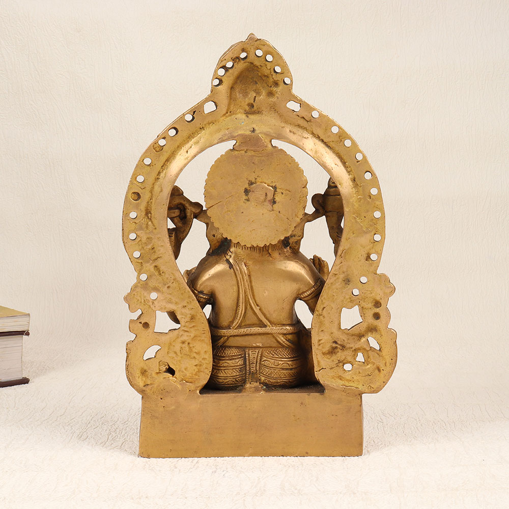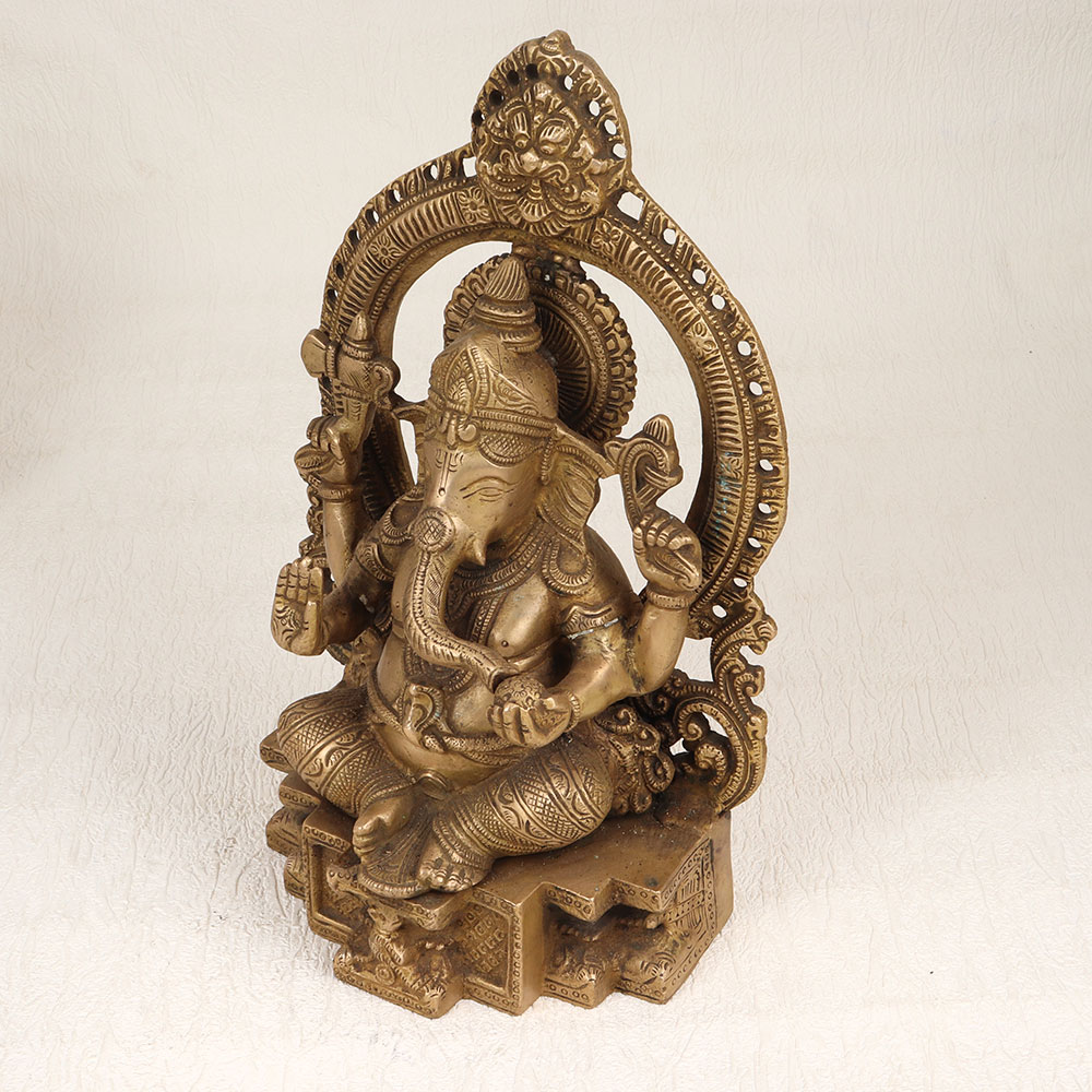 Enhance your spiritual and aesthetic space with this exquisite Brass Lord Ganesha Statue featuring a meticulously crafted Prabhavali and adorned with an enchanting antique brown finish. Handmade by highly skilled Indian artisans using premium-quality brass, this divine creation seamlessly blends tradition with artistry. The intricately designed Lord Ganesha sits majestically, exuding an aura of divinity and grace. The Prabhavali surrounding the deity enhances the overall appeal, creating a harmonious and captivating visual experience. The antique brown finish adds a touch of timeless elegance, making it a standout piece suitable for various settings. Versatile in its placement, this statue is ideal for your home, office, restaurant, hotel, or cafe prayer room. Beyond its spiritual significance, it serves as a remarkable decorative element that effortlessly complements any interior. As a unique addition to a vintage collection, this brass Ganesha statue becomes a conversation starter, reflecting both cultural richness and artistic finesse. Moreover, this handmade masterpiece makes for a thoughtful and meaningful gift for your loved ones on special, festive, or auspicious occasions.