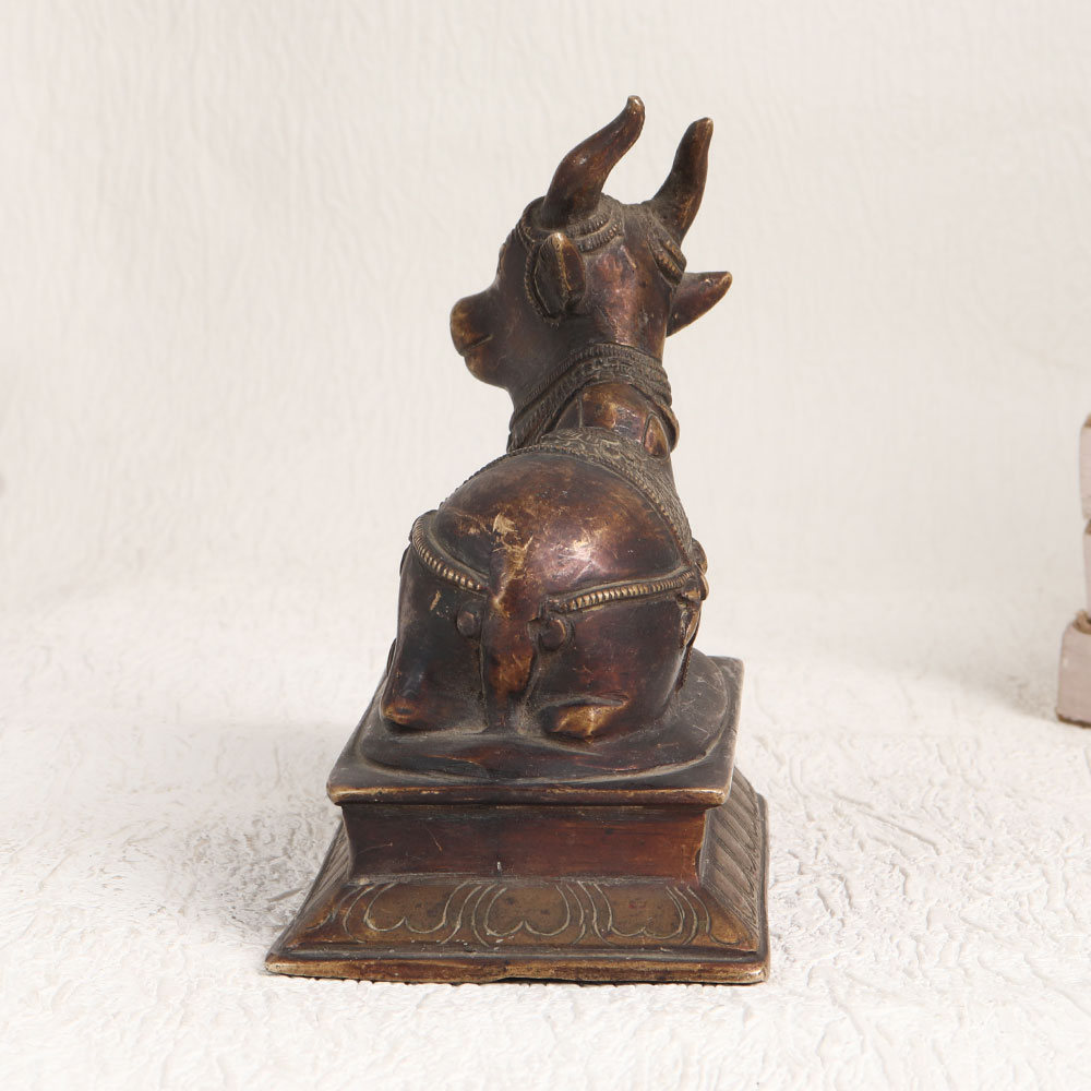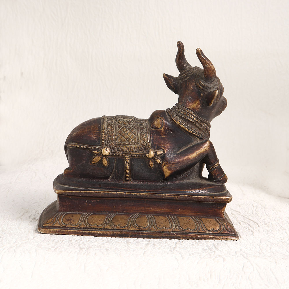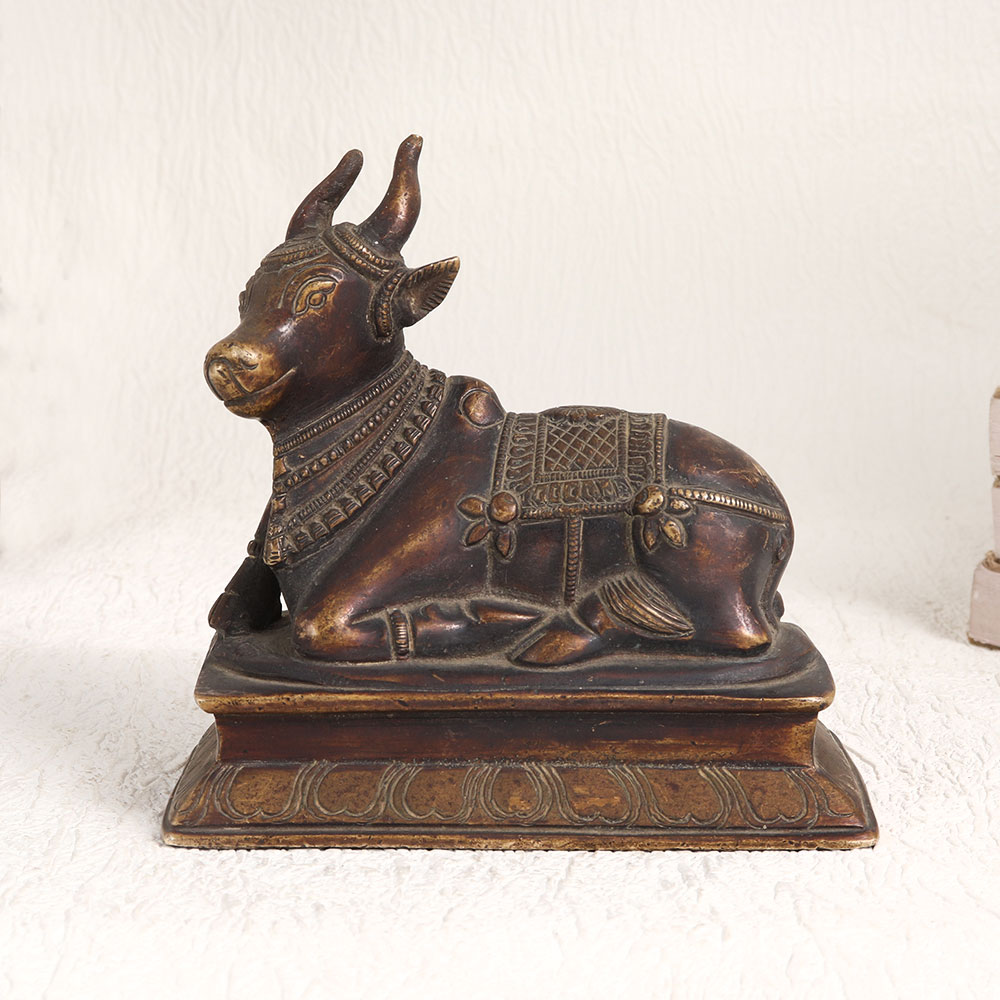 This antique brown finish brass statue of Lord Nandi is a true testament to the craftsmanship of skilled Indian artisans. This exquisite creation captures the essence of devotion and tradition in every intricate detail. Sitting atop a beautifully crafted platform, Lord Nandi, the divine bull and sacred vehicle of Lord Shiva, exudes an aura of serenity and grace. The antique brown finish adds a touch of timeless elegance, making it a perfect addition to any space. Whether you choose to place it at home, in your office, a restaurant, hotel, cafe, or shop, this statue brings a sense of tranquillity and spiritual energy. Not only is this brass statue ideal for worship and decoration, but it also serves as a remarkable collectible piece or exhibition display. It embodies the rich heritage of Indian culture and can be a meaningful gift for your loved ones on special, festive, or auspicious occasions.