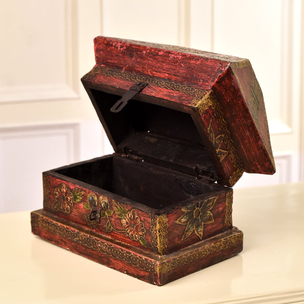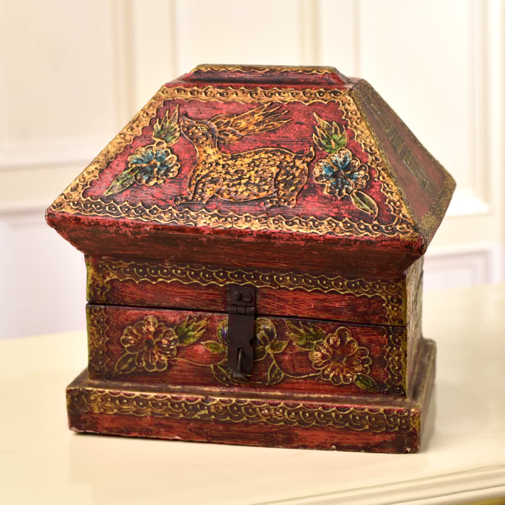 Buy a handmade wooden box online which is a testament to the skillful artistry of Indian craftsmen. Crafted from high-quality wood, the box boasts a rich tapestry of animal and floral engravings, each stroke telling a story of tradition and precision. The vibrant, multi-coloured palette adds a touch of whimsy, making it a visual delight. Equipped with a charming latch, this box is not only a repository for your cherished jewelry but also a home for small trinkets and treasures. Its versatility extends beyond practicality - it's a piece of art that begs to be showcased. Picture it adorning your dressing table or stealing the spotlight at an exhibition, capturing attention with its intricate details. As a gift, this box transcends the ordinary. Delight your loved ones on special or festive occasions with a token of artistry and tradition.