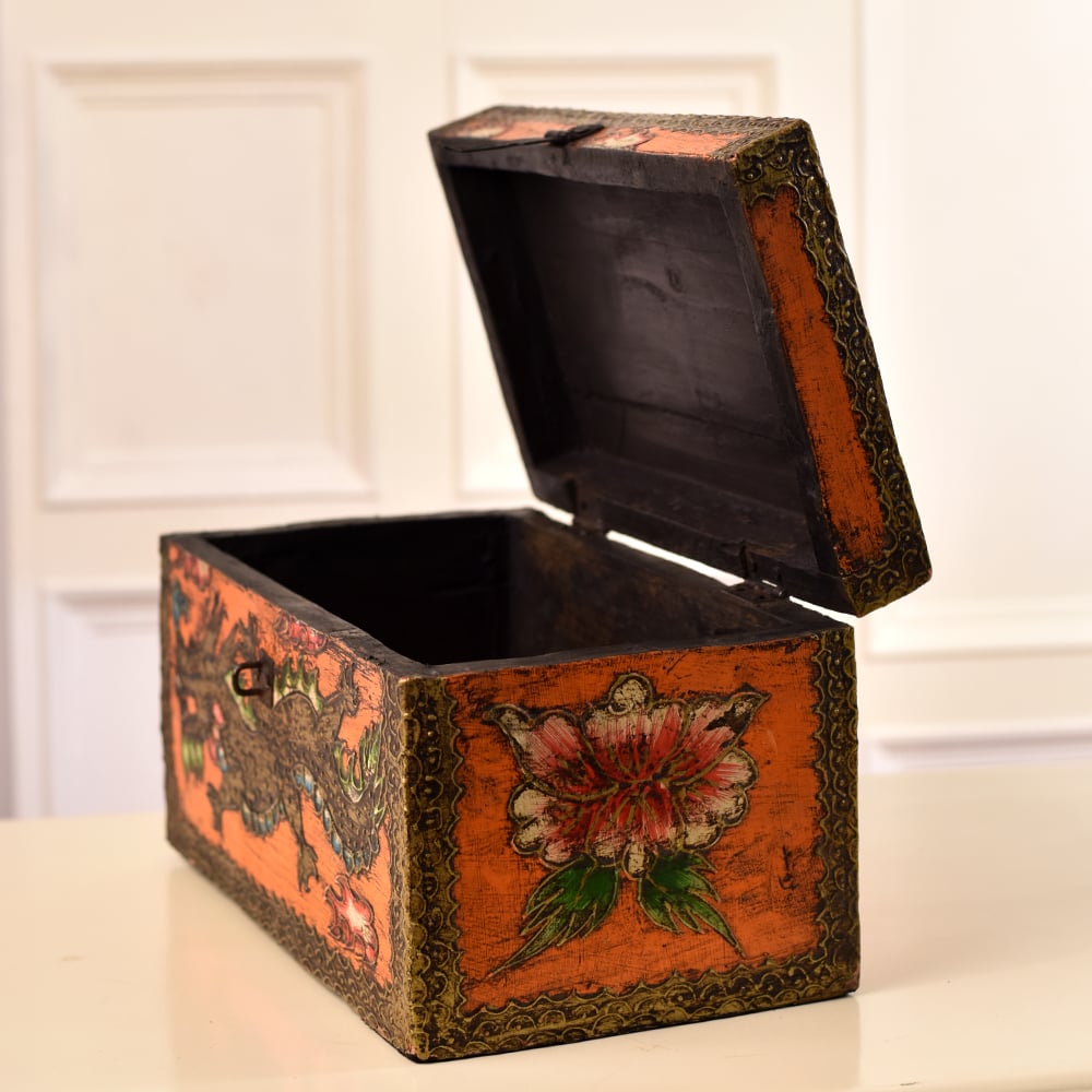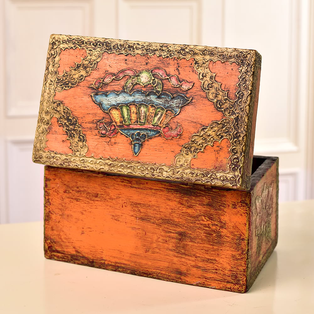 Adorn your interior with our exquisite handcrafted wooden box that is a true testament to the craftsmanship of highly skilled and experienced Indian artisans. This multi-coloured masterpiece features intricate engravings of a majestic dragon and other beautiful designs, showcasing the rich cultural heritage of India. Crafted from high-quality wood, this box is not only visually stunning but also built to last. The attention to detail and precision in each engraving is a testament to the dedication and skill of the artisans who painstakingly create these treasures. With a secure latch, this box is perfect for storing your cherished jewelry and other small items, keeping them safe and organized. Its versatility extends beyond functionality, as it can also serve as a stunning exhibit piece, adding an aura of sophistication to any space. Whether you're seeking a unique addition to your own collection or a thoughtful gift for a loved one on special or festive occasions, this wooden box is a testament to artistry, culture, and timeless elegance.