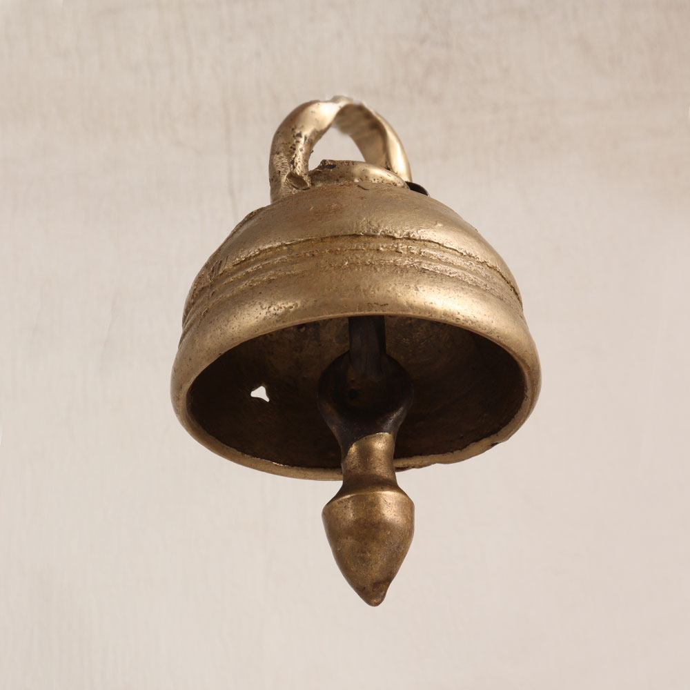A Vintage Bell Metal Bell with a hanging loop that showcases an enchanting antique brown finish. Meticulously crafted by skilled Indian artisans in the renowned Himachal Art tradition, this bell embodies the rich heritage of bell metal craftsmanship. Constructed using high-quality bell metal, this bell resonates with a melodious chime that adds a touch of serenity and elegance to any space. Its versatility knows no bounds, it's perfect for adorning your home, office, restaurant, hotel, cafe, or shop prayer room. Place it by your entrance for a warm welcome or hang it in your prayer room to create a tranquil ambiance during your moments of reflection. This exceptional piece isn't just a decor item, it's a cherished artefact that can grace your vintage collection or become the centerpiece of your exhibition. As a thoughtful gift, it carries a touch of tradition and spirituality, making it a meaningful gesture for your loved ones on special, festive, or auspicious occasions.