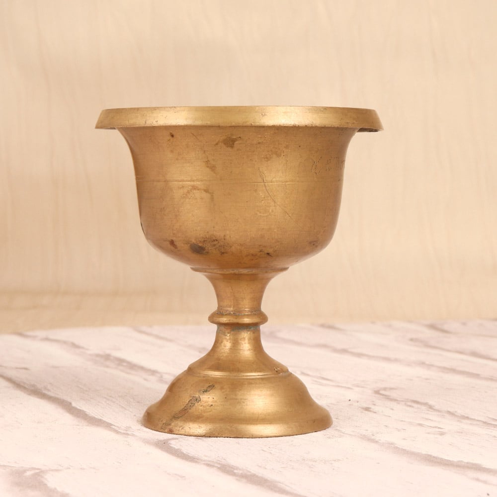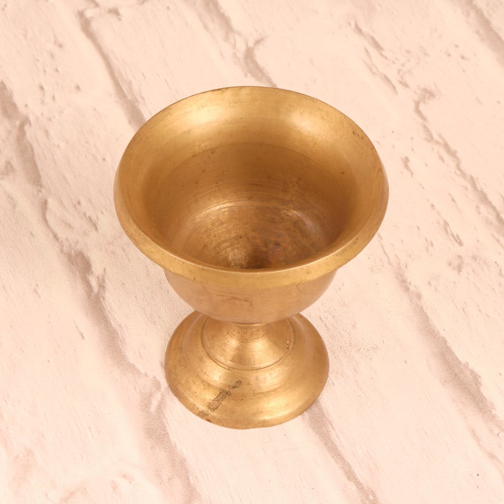 Discover the captivating allure of this vintage brass holy water cup, a stunning piece of South Indian art that will transport you to a realm of reverence and tranquility. Crafted with meticulous attention to detail, this cup exudes an aura of timeless elegance, perfect for adorning your sacred space or enhancing your spiritual rituals. Infuse your home or temple with the rich cultural heritage of South India. This brass holy water cup serves as a tangible connection to the region's centuries-old traditions, allowing you to immerse yourself in the profound spirituality that has shaped the lives of countless devotees. Whether you're a collector of fine art or a seeker of sacred objects, this captivating piece will elevate your décor and deepen your spiritual journey. Imagine the gentle gleam of the brass catching the light as you prepare for your daily rituals, or the soothing sound of the water as you pour it into the cup. This versatile vessel can also be displayed as a decorative accent, imbuing your space with a sense of reverence and timeless elegance. Bring the rich cultural heritage of South India into your home and let this vintage brass holy water cup become a cherished centerpiece of your sacred space.
