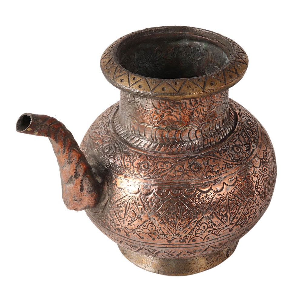 This handmade copper holy water pot is engraved with beautiful floral designs. It has Islamic carvings. Holy water pots are used in temples and homes.