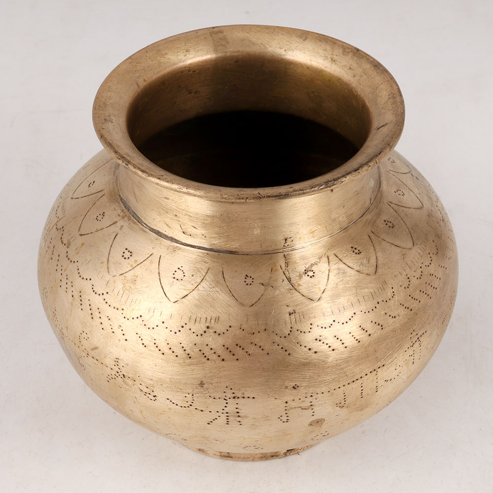 This Brass Holy Water Pot is a stunning creation crafted by skilled Indian artisans using high-quality brass. This sacred lota features intricate dotted engraving and a resplendent golden finish, exuding an aura of divine beauty. A vital element of religious ceremonies in temples, this holy water pot is primarily used for offering water to the revered Shivling and sun god, as well as during various rituals and havans. Its profound significance in Indian culture makes it a cherished item that brings spirituality and reverence to any sacred space. Beyond its religious applications, this brass lota also holds symbolic value in Vastu and Feng Shui traditions. Placing it in the north or east of one's home, filled with water, is believed to radiate positive energy and harmonize the environment. This multifunctional piece is not only a religious artefact but also doubles as an elegant flower pot, adding a touch of sophistication to your living spaces. Its versatility makes it a thoughtful and meaningful gift choice for loved ones, especially on special or festive occasions, symbolizing blessings, prosperity, and good fortune.