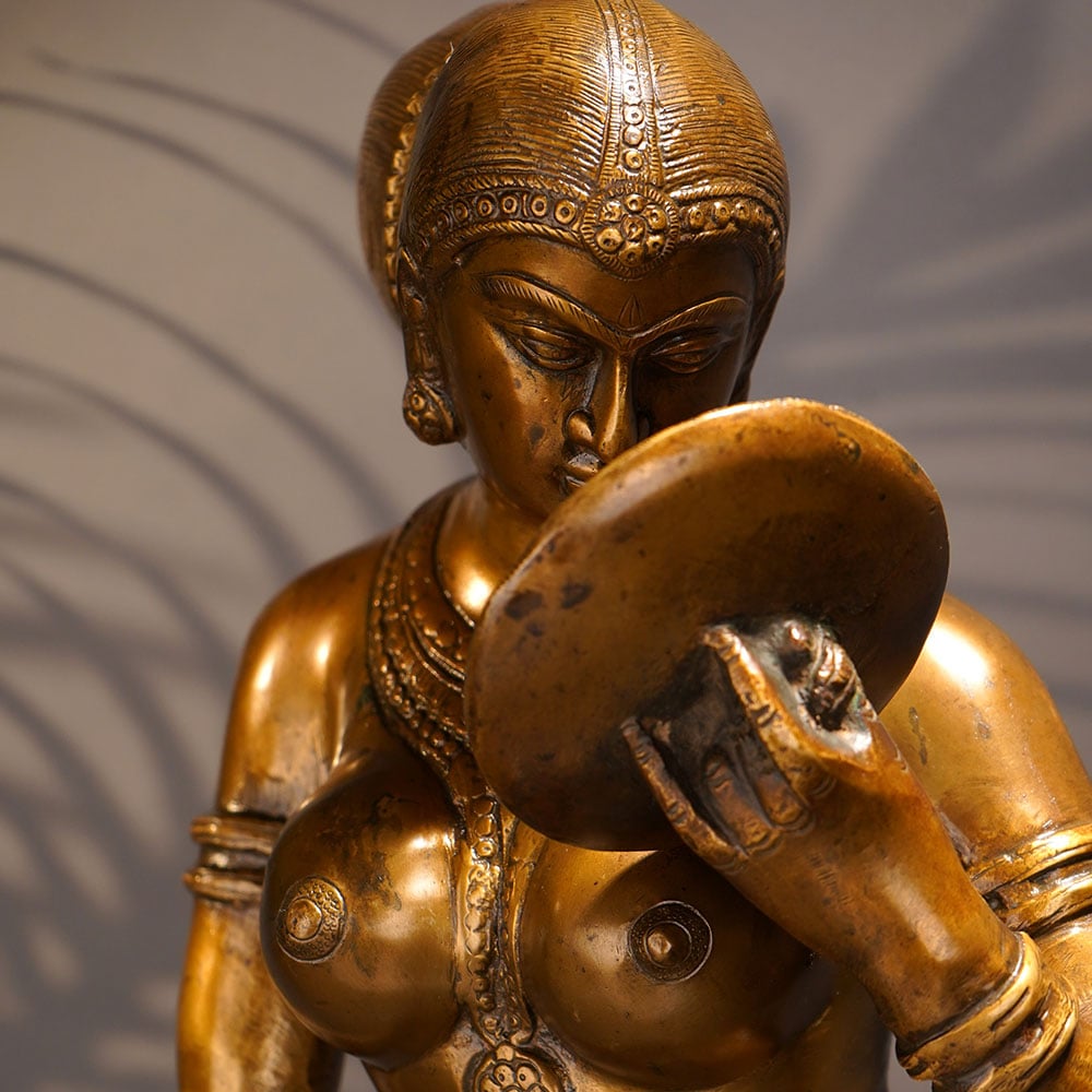 Bring the timeless elegance of Indian artistry into your home with this stunning brass statue of an Indian lady. Crafted with meticulous detail and a keen eye for cultural tradition, this piece is a true masterpiece that will elevate the ambiance of any space. This vintage brass statue is more than just a decorative item - it's a window into the rich cultural heritage of India. The woman's elegant stance and delicate features capture the essence of Indian femininity, while the gleaming brass material adds a touch of timeless sophistication. Display this statue in your living room, bedroom, or entryway to infuse your space with the beauty and wonder of Indian artistry. Whether you're an avid collector or simply appreciate fine craftsmanship, this brass Indian lady statue is a must-have addition to your home.