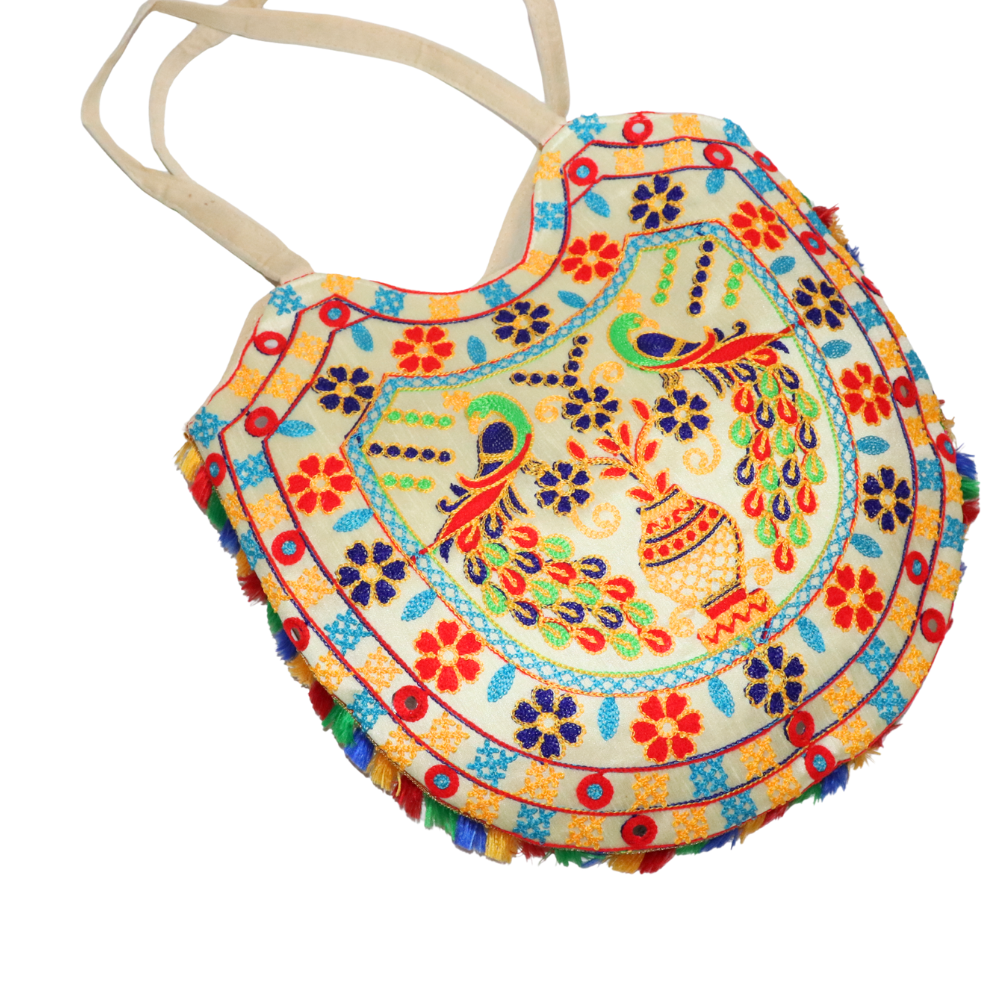 Add a splash of vibrant tradition to your wardrobe with this stunning Handmade Jaipuri Handbag. Expertly crafted from premium cotton, this colorful tote features intricate multicolor embroidery showcasing traditional Rajasthani motifs – including elegant peacocks, floral patterns, and a decorative pot centerpiece. The soft yet sturdy dual handles make it perfect for everyday use, whether you're shopping, heading to work, or accessorizing an ethnic outfit. Lightweight, eco-friendly, and spacious enough for essentials, this ethnic tote blends cultural charm with practical design, making it an ideal gift or personal accessory.