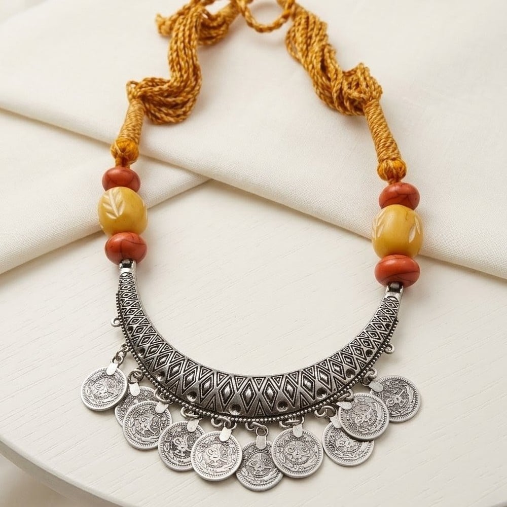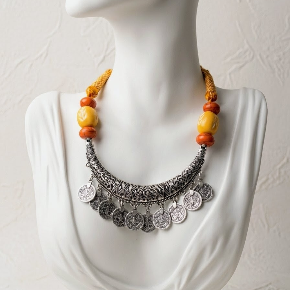This handcrafted handmade jewelry beaded coin tassel necklace is a bold statement piece designed to bring vibrant energy to your wardrobe. Featuring a striking combination of yellow and orange beads along with engraved metallic elements, this necklace blends traditional artistry with modern styling.